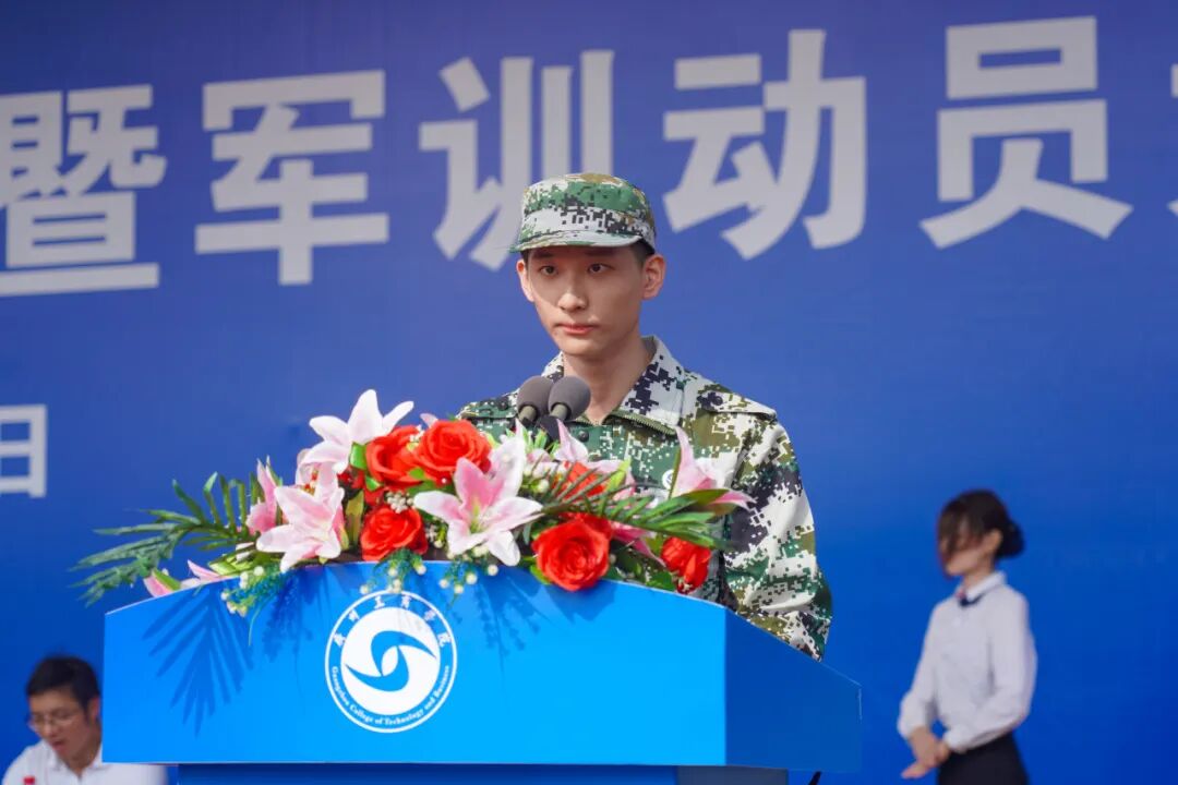 来自商学院市场营销专业的新生王甜甜,代表全体同学承诺将严格要求自己,克服困难,团结协作,遵纪守法,尊重教官,迎接军训挑战,创造美好回忆。她呼吁同学们以饱满的热情迎接大学生活及军训这一首次挑战,并预祝军训圆满成功。