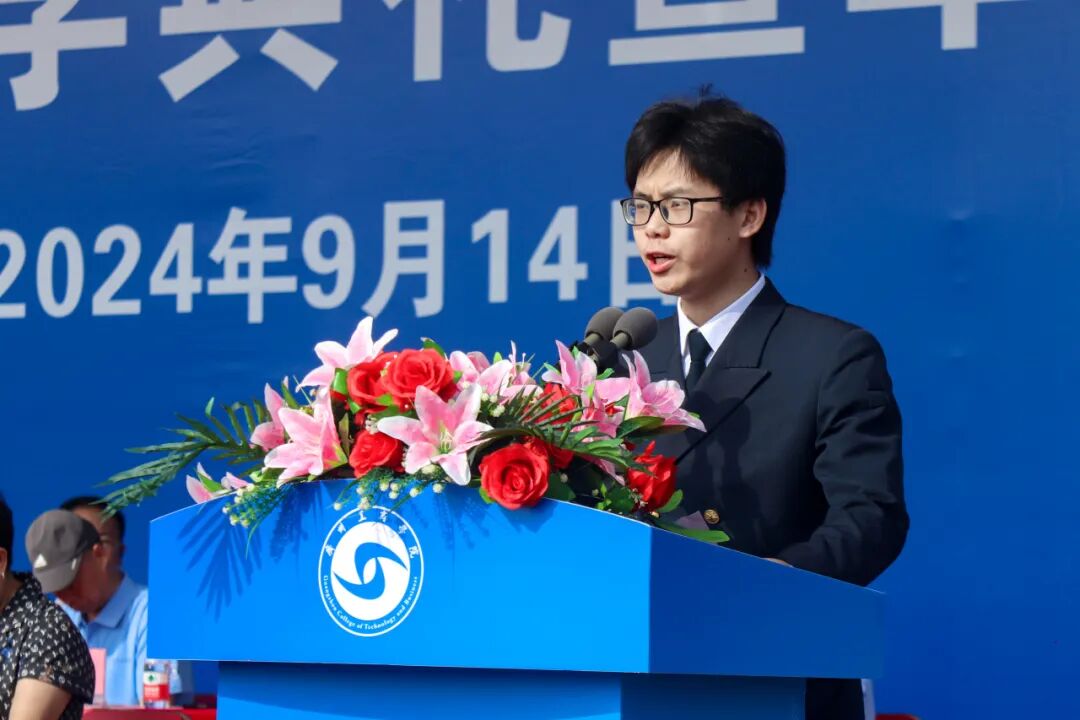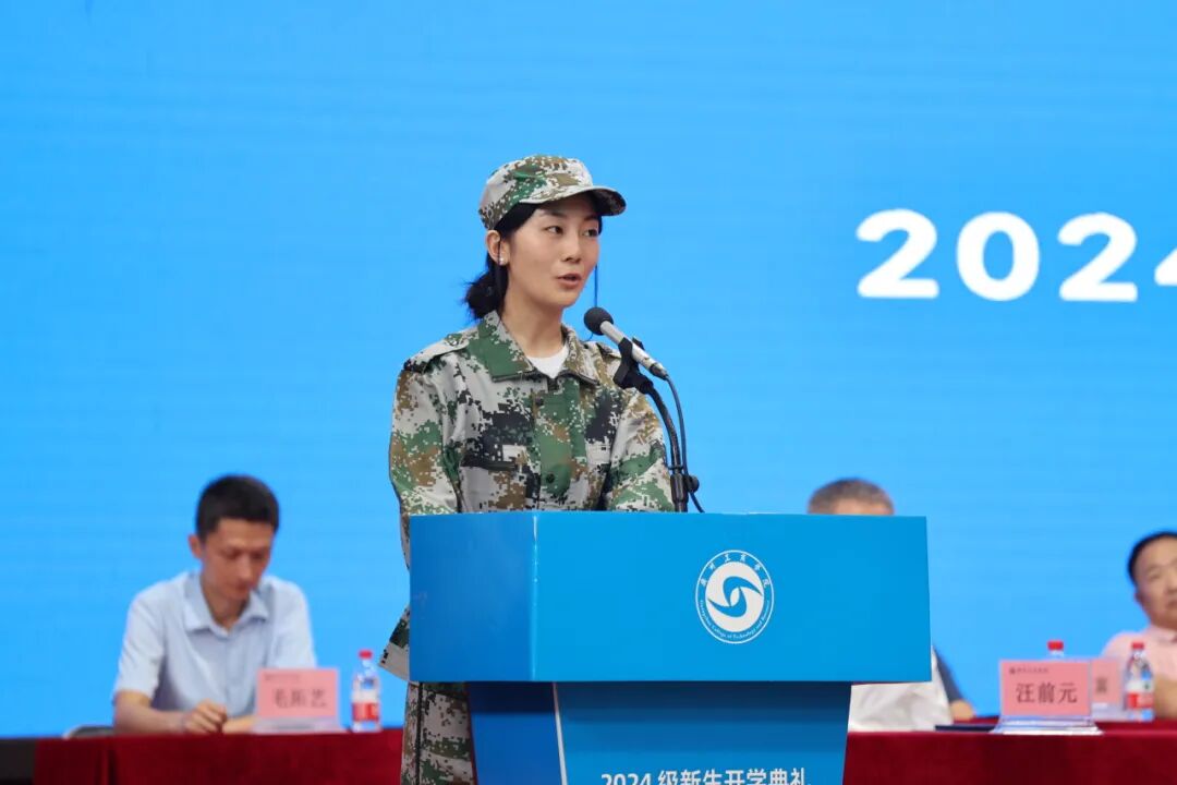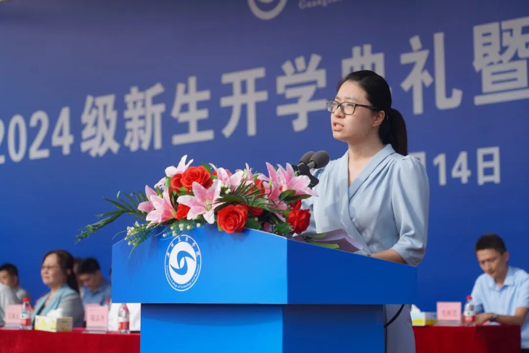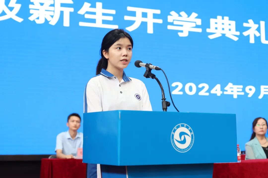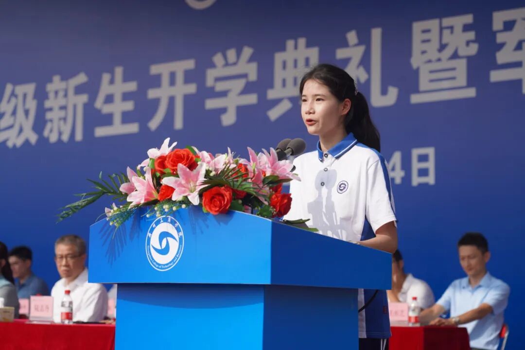 音乐学院音乐表演专业的林雯湘同学提到,大学是新生的新起点,充满挑战与机遇。她引用习近平总书记的话,激励新生们肩负时代使命,珍惜青春、不负韶华。她代表新生承诺将践行校训精神,提升综合素质,弘扬优良学风,全面发展成为新时代好青年。