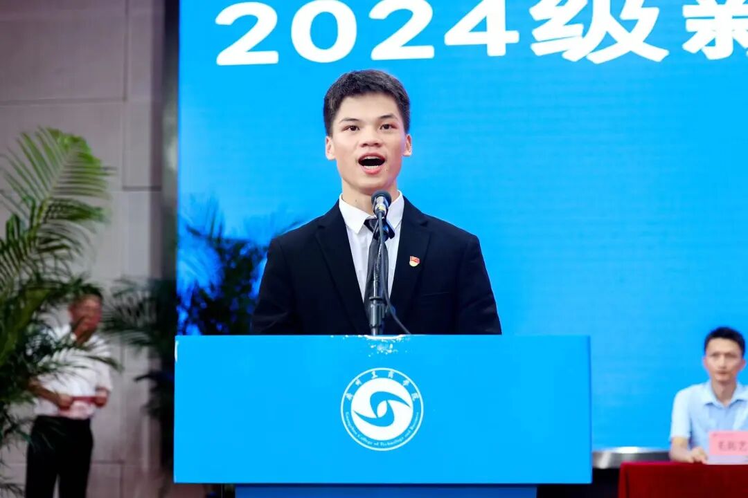 来自外语学院22商务英语B11班的邓星,分享了自己在“正德厚生、励志修能”校训激励下的成长经历。他强调了明确目标、善用资源、珍惜时光的重要性,鼓励新生积极投入大学生活,勇敢追梦,祝愿新生们在广州工商学院收获知识、友情与美好回忆,未来前程似锦。