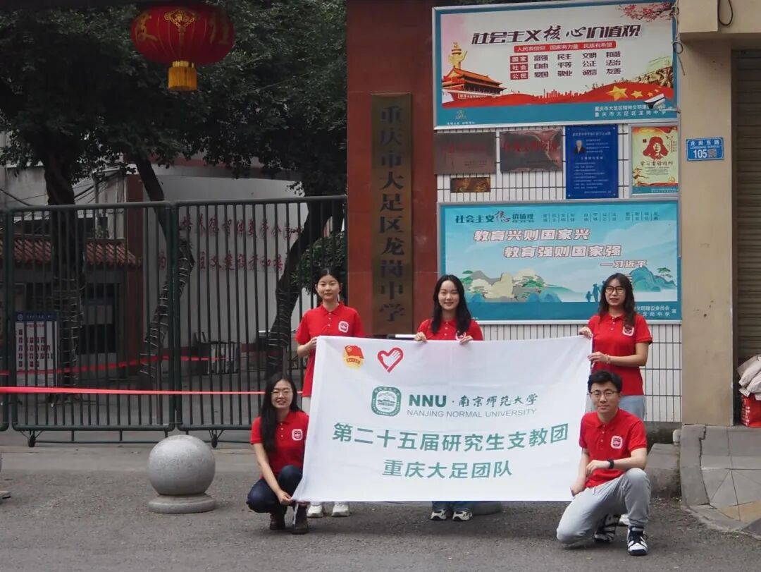 南京师范大学研究生支教团重庆大足团队自2015年组建以来,前后已有9届研究生支教团、共计45名志愿者来到重庆市大足区开展支教工作。团队曾募集助学金资助40名“阳光班”贫困同学,众多爱心人士长期定向资助,共计约14万元。“阳光班”的一名学生也顺利考取南师大,并在毕业后投身西部计划,赓续厚生精神。团队获得了第四届重庆市助残志愿服务项目大赛优秀奖、大足区优秀西部计划志愿团队等荣誉,入选团中央“镜头中的最美支教团”,荣获2020年度江苏省“学雷锋活动示范点”荣誉称号。2019年五四运动一百周年之际,时任江苏省委书记娄勤俭批示点赞研支团事迹并给予勉励“让青春在实现中华民族伟大复兴的中国梦中展现蓬勃英姿”。校党委常委、宣传部部长宋喆一行在海棠中学看望慰问研支团志愿者![image2.jpeg]()