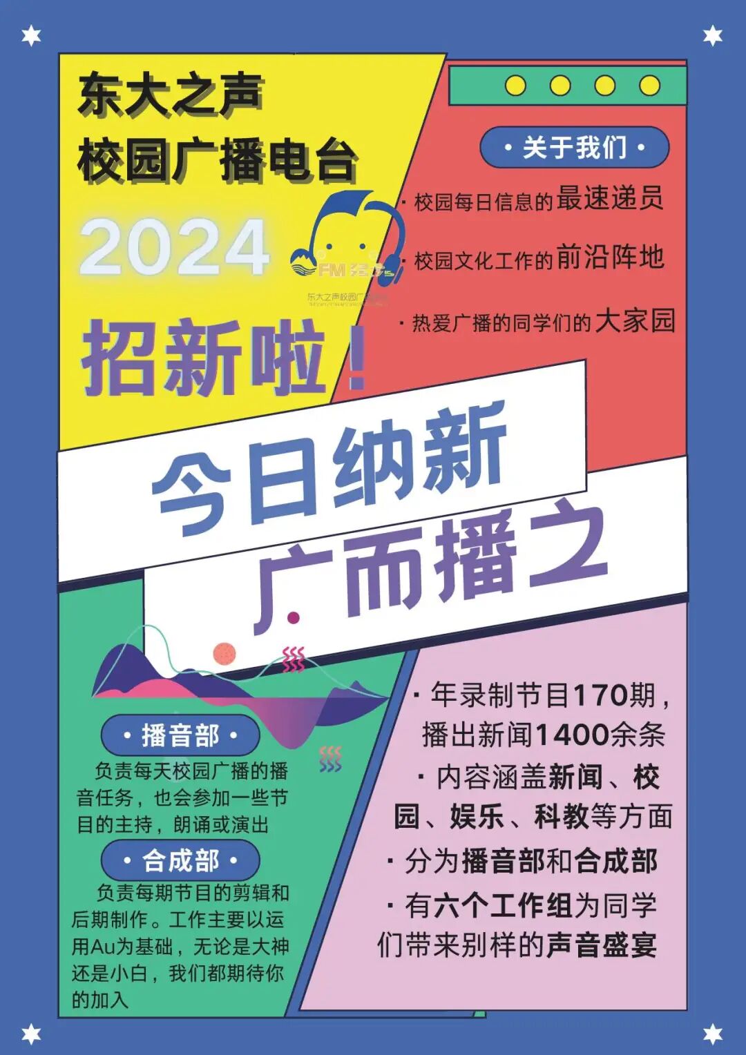 “东大之声”广播电台学生记者团现有100余人,下设播音部、合成部2个部门,播出节目涵盖理论学习、校园新闻、社会热点、传统文化等多个方面。“东大之声”为一批批对播音、合成工作充满兴趣与热爱的同学提供广阔的舞台和发展空间。