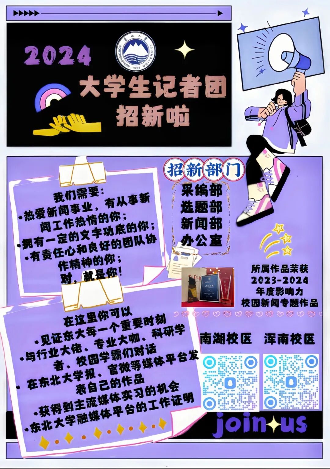面对面采访超强大佬,走进校园活动一线,作品刊登在东北大学报上……大学生记者团设置有秘书部、采编部、选题部、新闻部,氛围自由,任务自愿领取,学长学姐一对一培养,不限年级和校区,如果你热爱文字,喜欢创作,大学生记者团欢迎你!