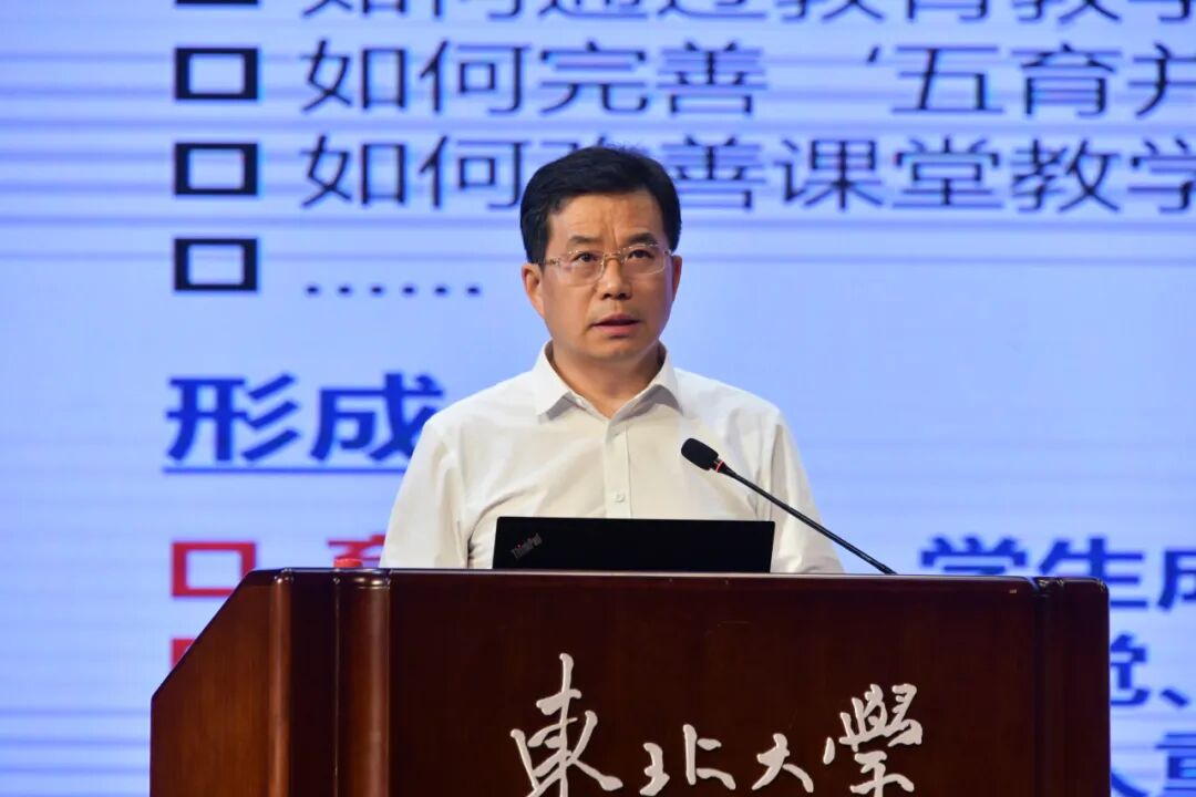 王强从总体要求、主要内容、组织实施、工作要求和任务分工等几个方面,对东北大学教育思想大讨论工作进行了部署。王强指出,要通过教育思想大讨论,努力营造符合新时代要求的教育文化,深入思考并回答“百年东大形成了什么样的人才培养特色和育人理念”“在新时代确定什么样的人才培养目标”“如何通过深化体制机制和机构改革,适应新时代拔尖创新人才自主培养要求”等事关一流人才培养的一系列深层次、关键性问题,在全校上下形成以学生成长成才为中心的育人理念,构建自觉、自省、自律、自查、自纠的质量文化,形成人人重视教学、尊重教学、敬畏教学的文化氛围,全面提高人才自主培养质量的思想自觉和行动自觉。