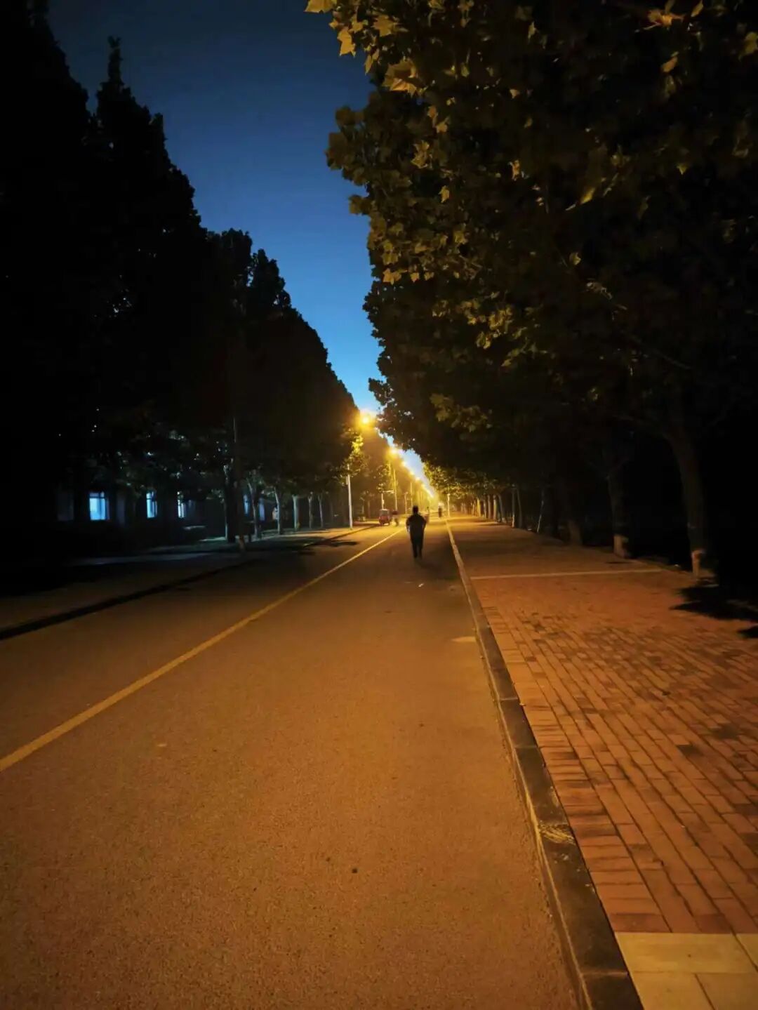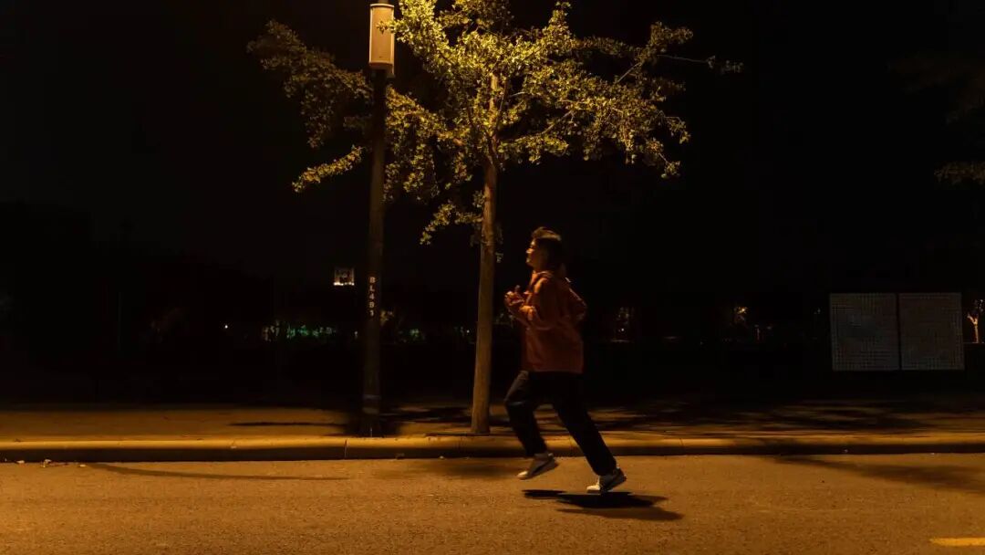 在灯光下影子摇曳的夜跑者