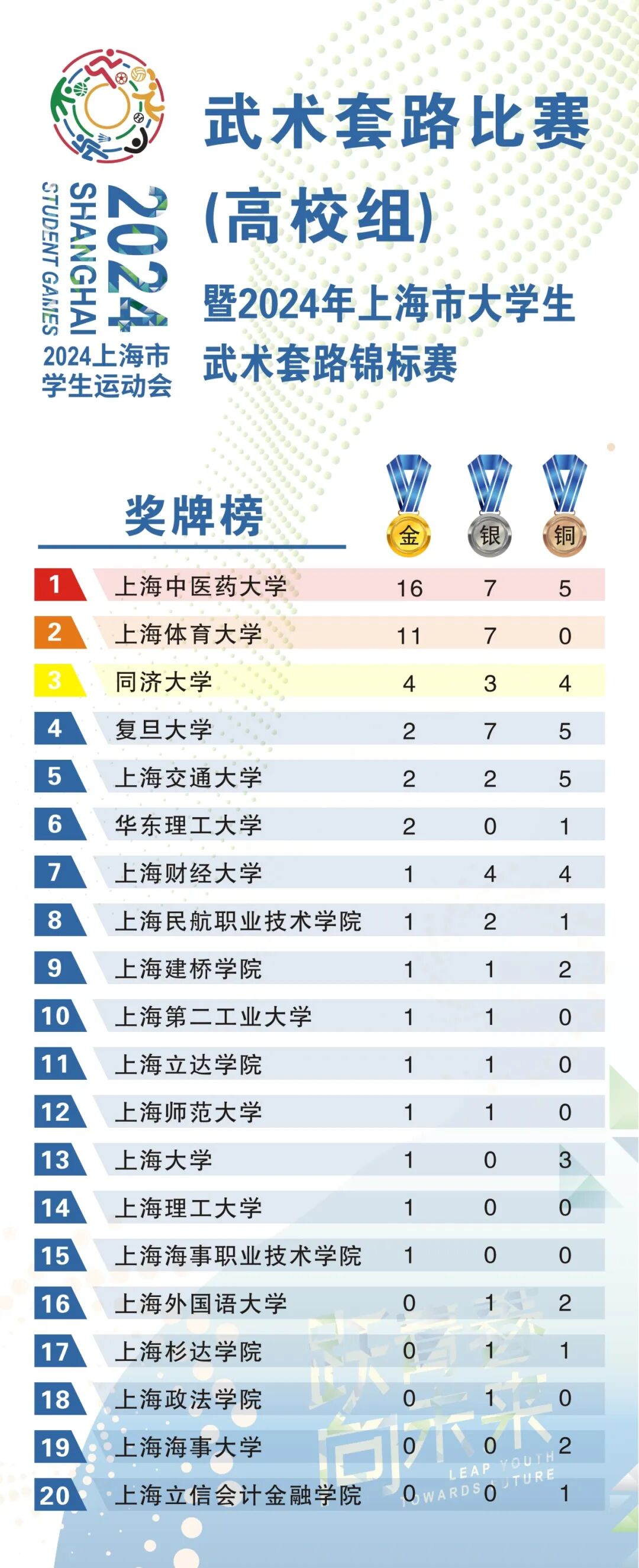 经过一整天的紧张比赛,最终上海中医药大学、上海体育大学和同济大学获团体总分前三名;我校武术队获16金7银5铜,位列奖牌榜第一名,其中高水平武术队获8金3银5铜,普通生武术队获8金4银。