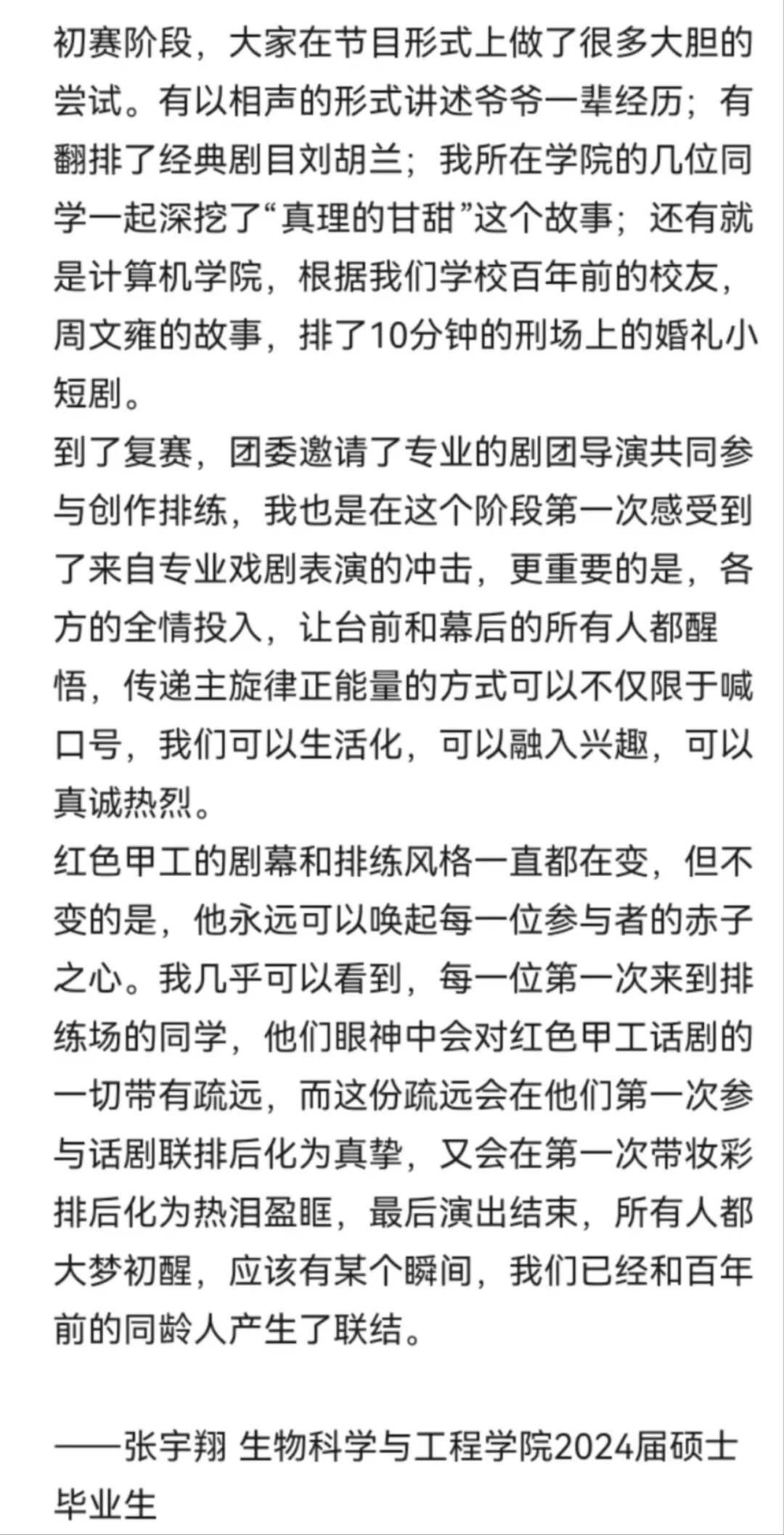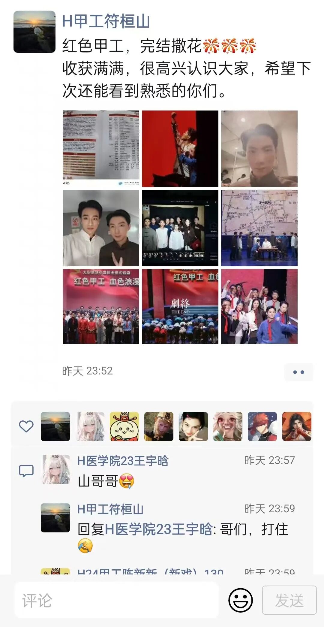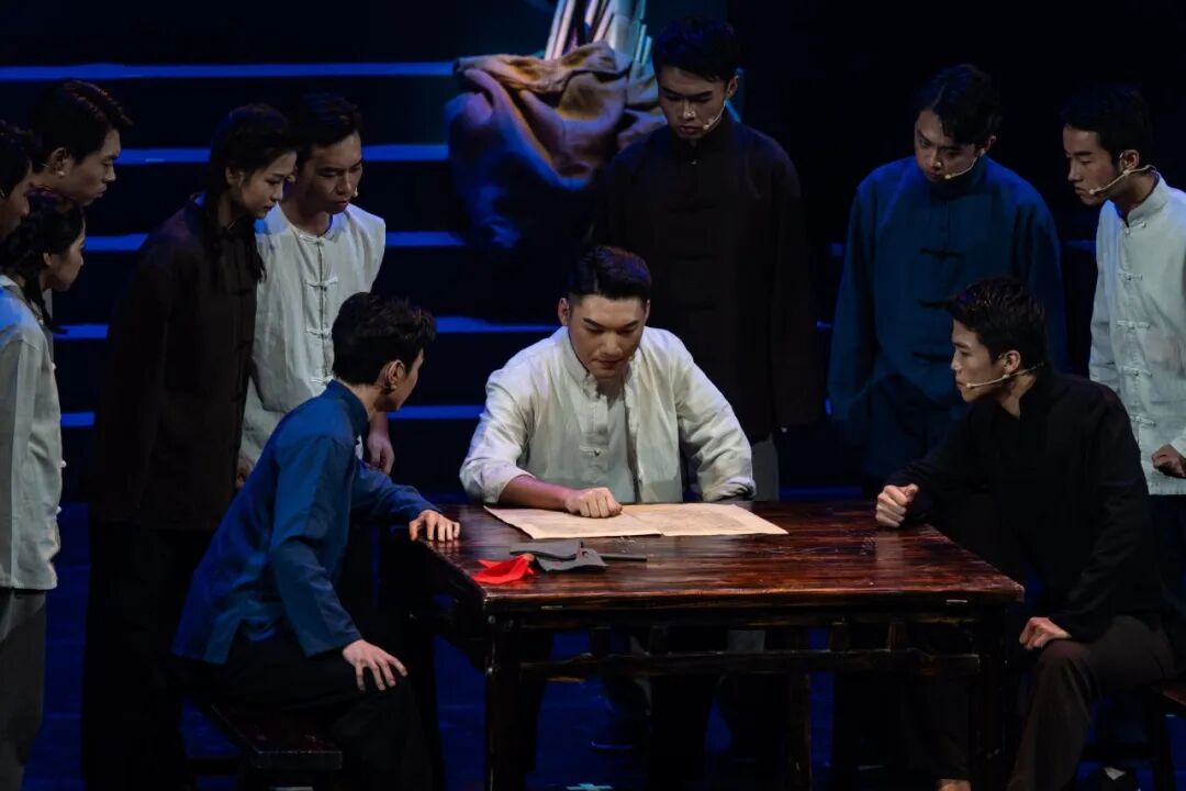 软件学院2023届校友、周文雍的饰演者张国良重回舞台再现红色经典,是饰演周文雍次数最多的演员;生物科学与工程学院2024届校友张宇翔,从2019年首映至今,先后出演了余教授、阿华、局长三个重要角色;工商管理学院2022级硕士研究生王一杰,以演员、导演、舞台监督等多重身份,参与演出18场;此次演出中饰演杨匏安的演员、2023级电力学院本科生杨森,年仅17岁,却凭借自己对角色的深刻理解,以娴熟的演技成功塑造了这一重要角色。