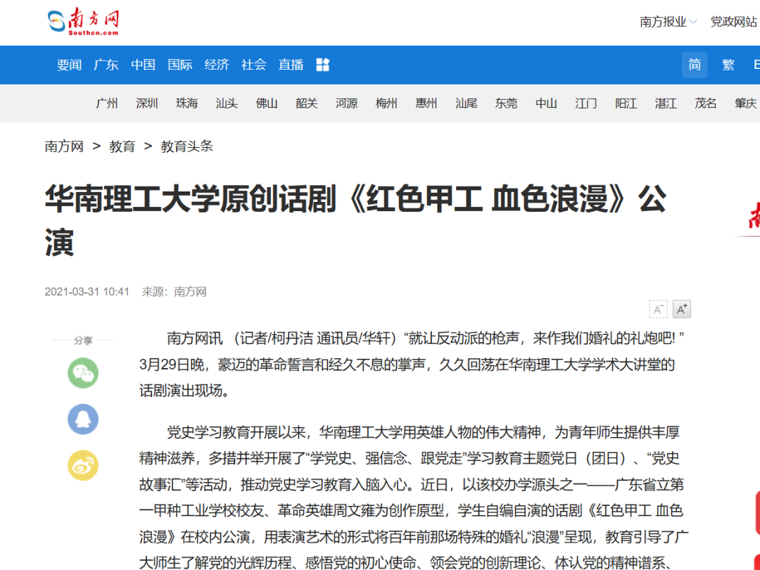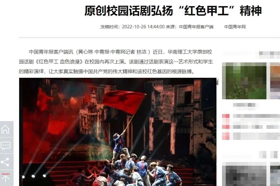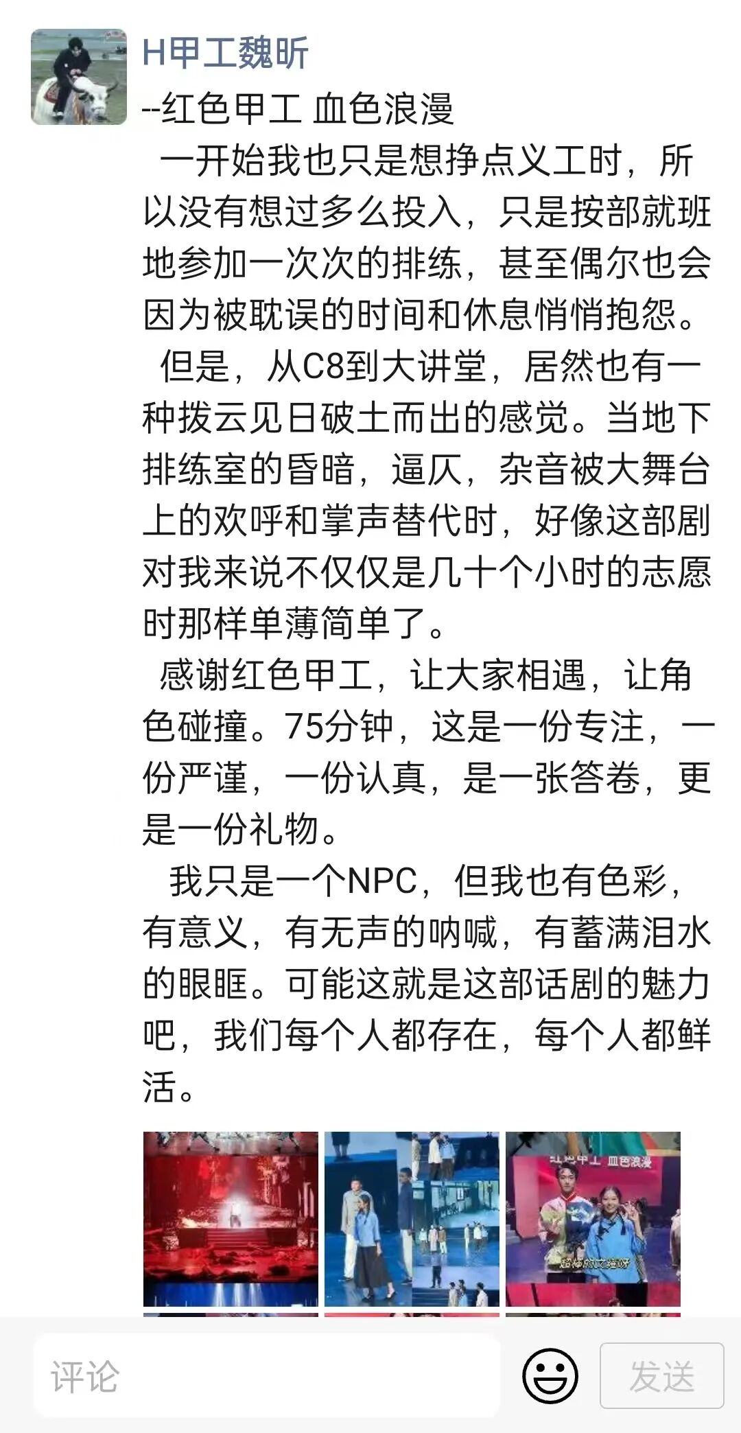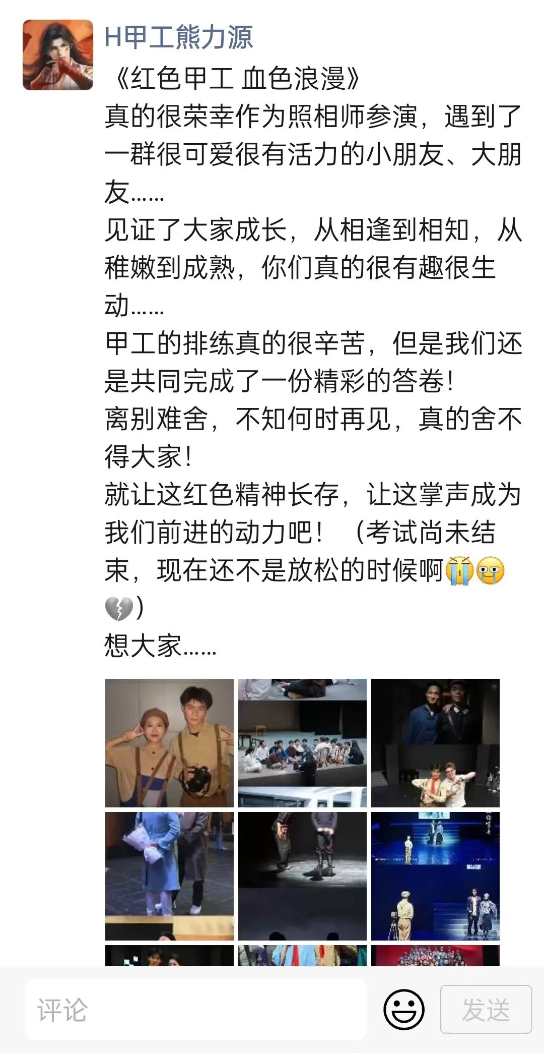 软件学院2023届校友、周文雍的饰演者张国良重回舞台再现红色经典,是饰演周文雍次数最多的演员;生物科学与工程学院2024届校友张宇翔,从2019年首映至今,先后出演了余教授、阿华、局长三个重要角色;工商管理学院2022级硕士研究生王一杰,以演员、导演、舞台监督等多重身份,参与演出18场;此次演出中饰演杨匏安的演员、2023级电力学院本科生杨森,年仅17岁,却凭借自己对角色的深刻理解,以娴熟的演技成功塑造了这一重要角色。