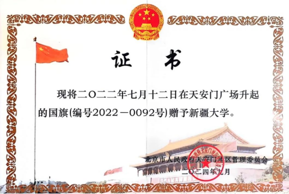 2024年9月6日,北京市人民政府天安门地区管理委员会向新疆大学赠送国旗仪式在北京举行。北京市人民政府天安门地区管理委员会向新疆大学赠送的是编号2022-0092号的国旗。此面国旗曾于2022年7月12日,习近平总书记考察新疆大学当天在天安门广场升起。