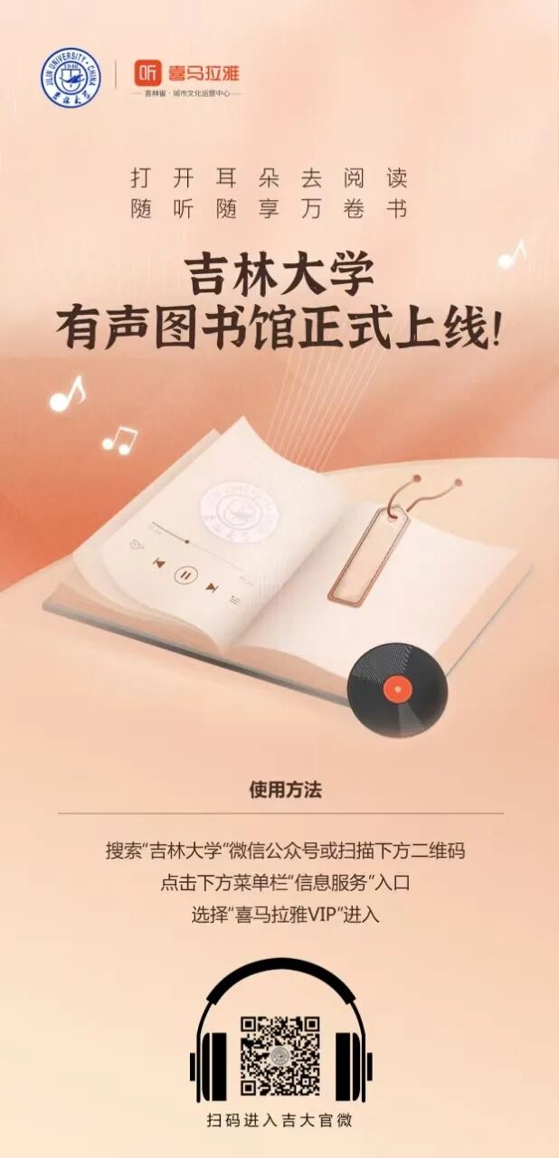 吉林大学引进喜马拉雅有声图书馆入校园,提供涵盖个人成长所需的人格品质塑造;通用能力、个人软实力提升;知识获取、专业技能培养三个维度的内容,为广大高校师生提供更加丰富的数字图书资源和更好的有声阅读体验。