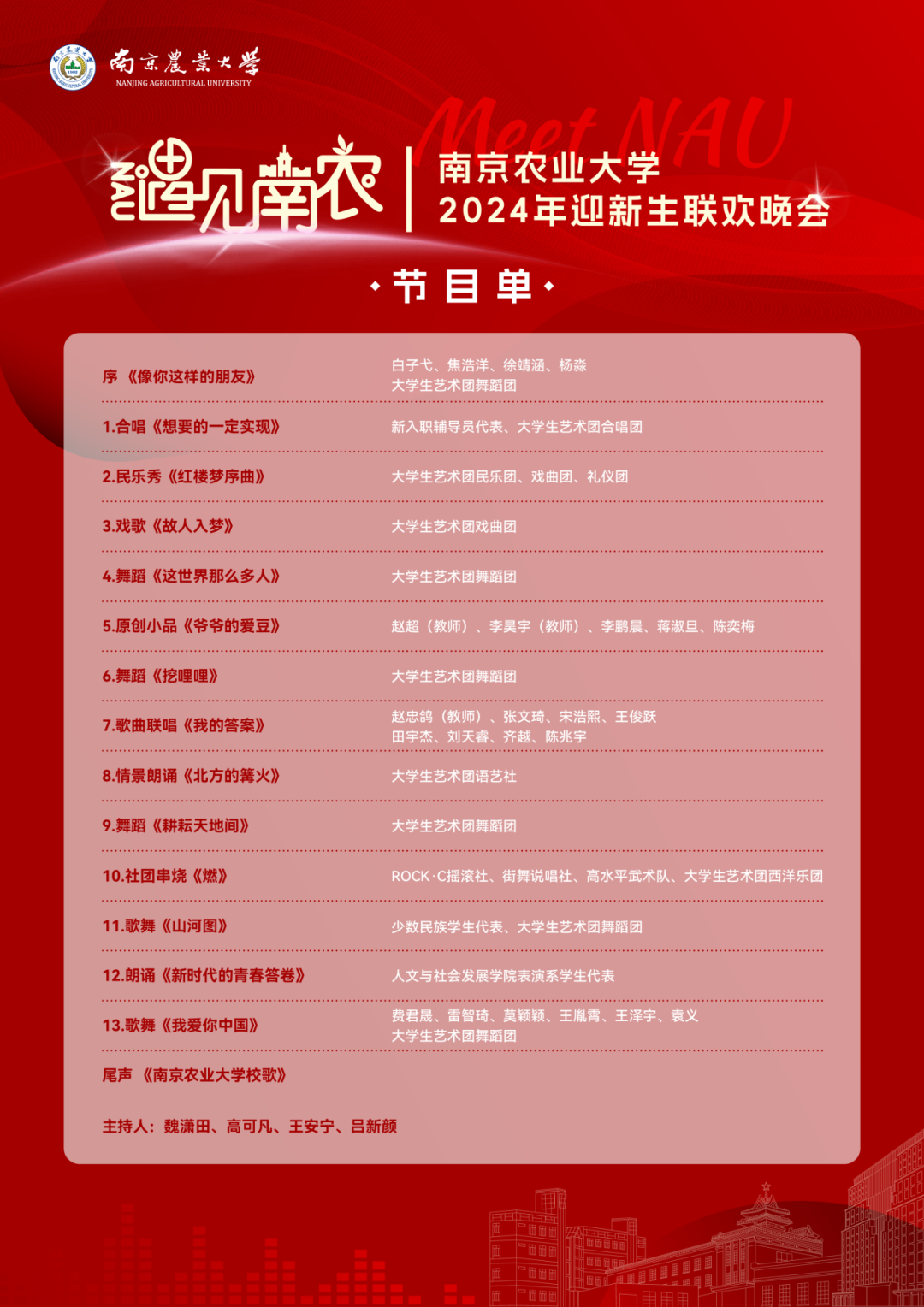 在如画般的秋日美景里,南京农业大学2024年迎新生联欢晚会将于10月13日在卫岗校区和大家正式见面啦!
