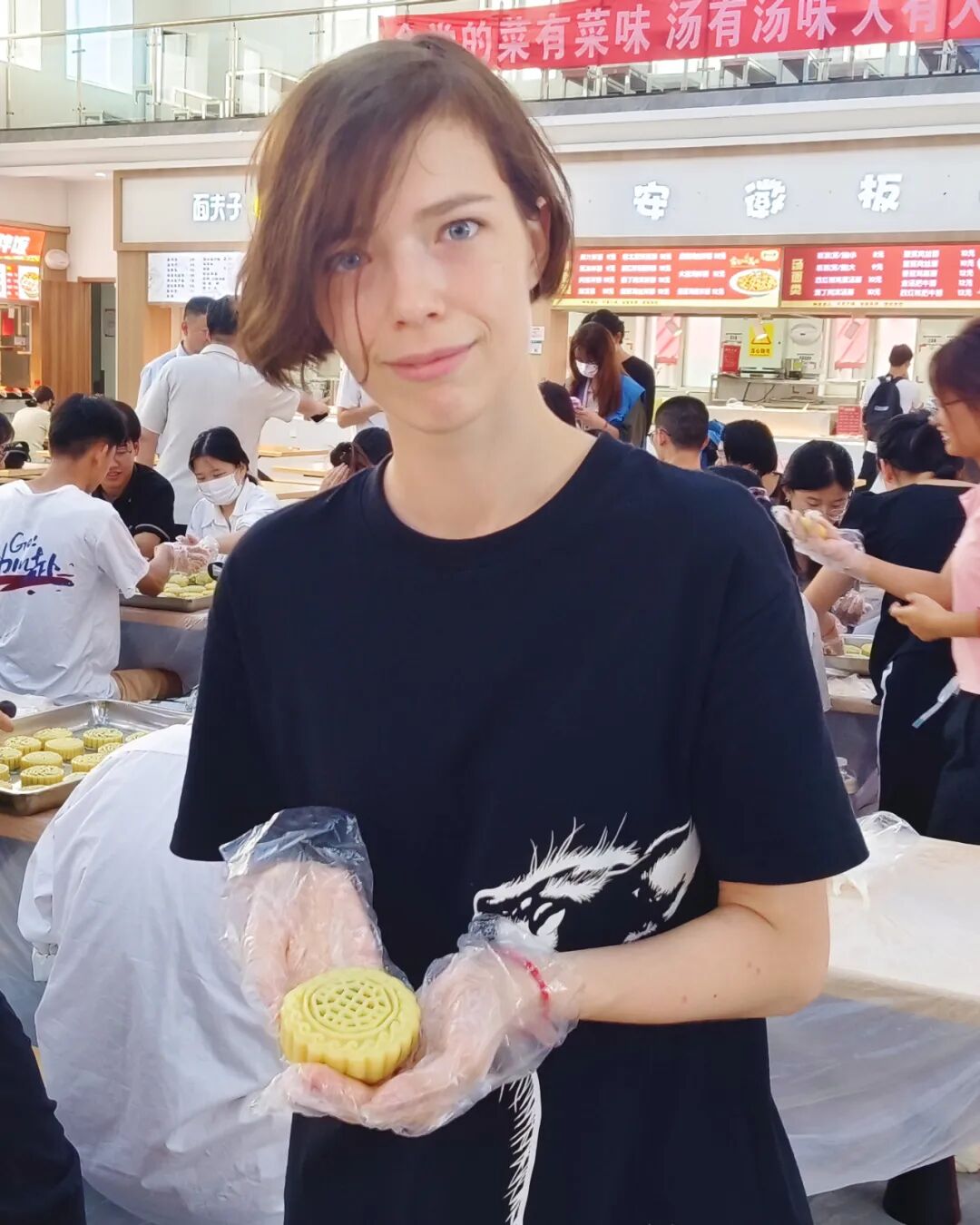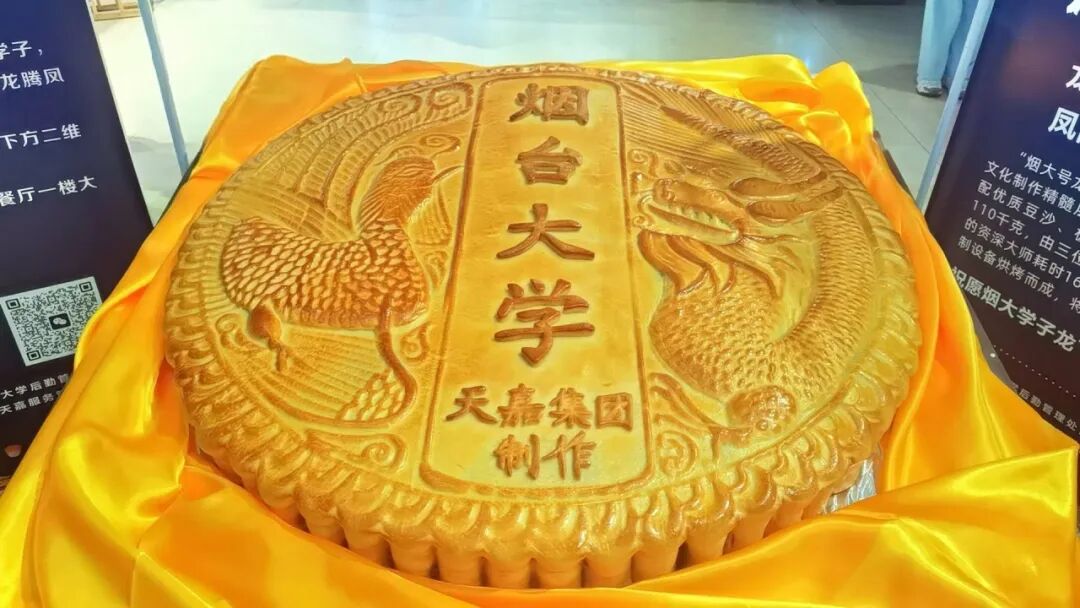 视角拉到六餐,学子们早已排起了长队,欢声笑语中满是期待的目光。他们将共同分享一块特大号月饼——“烟大号龙腾凤集”月饼。据食堂工作人员介绍,“烟大号龙腾凤集”大月饼,依托中国传统文化制作精髓层层把关。精选上乘白莲蓉,搭配优质豆沙、板栗、枣泥,直径1.1米,重达110千克,由三位拥有二十余年烘焙从业经验的资深大师耗时16小时精心烘焙,采用专属定制设备烘烤而成,将团圆完整展现。月饼,作为中秋节的传统美食,承载着团圆和幸福的寓意。学子们相聚一起谈论着家乡的习俗,分享着彼此的喜悦。