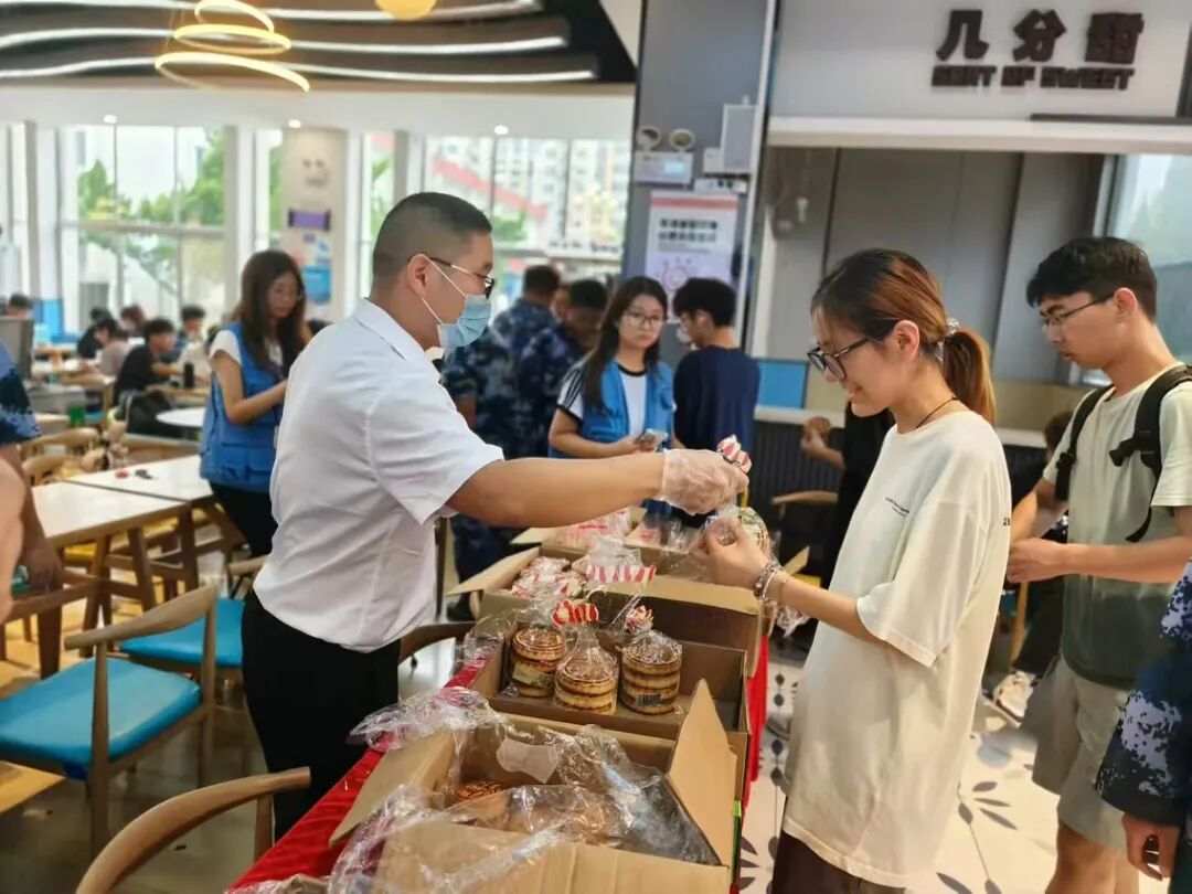 “同学们快来领月饼啦!”。学校二餐格外热闹,食堂工作人员早已准备就绪,他们面前摆放着一箱一箱精致的月饼,蜜枣馅、豆沙馅、五仁馅……浓浓的节日氛围弥漫在空气中,往来的学子们领到了最暖心的中秋节礼物,感受着学校带来的“家”的温暖。