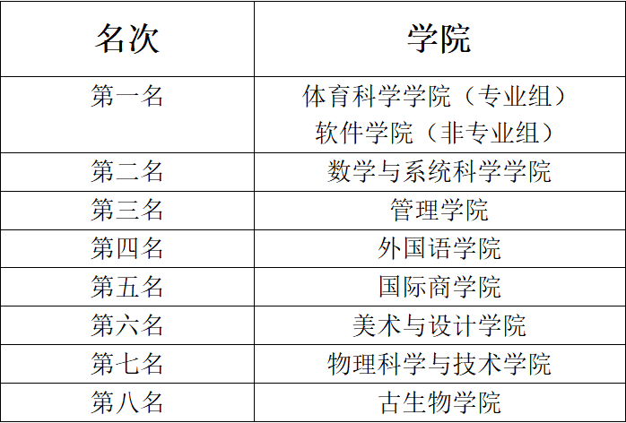 经过激烈的角逐,体育科学学院获得专业组第一名,软件学院获得非专业组第一名,数学与系统科学学院等七个学院获得非专业组第二至第八名的优异成绩。体育科学学院等十五个学院分别获得优秀组织奖、体育道德风尚奖、最佳精神风貌奖以及最佳团队合作奖。