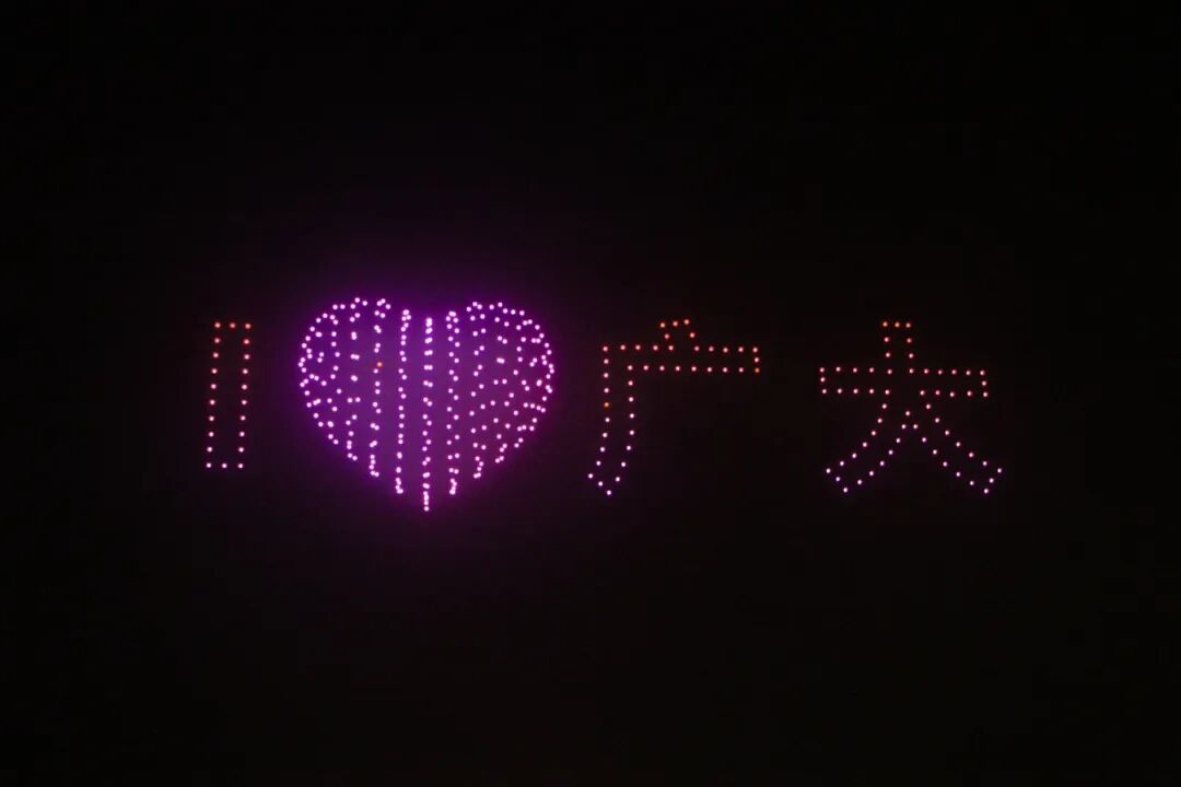 夜幕降临,宁静夜空下,500台无人机蓄势待发;灯光亮起,无人机编队承载着梦想缓缓升空。它们是天际的画师,描绘着五星红旗,广大画卷,校训塔,图书馆,广大校徽,等图案不断在空中变换,只为传达“我爱中国,我爱广大”,未来生活已经开启,我们要不断奔跑在路上。