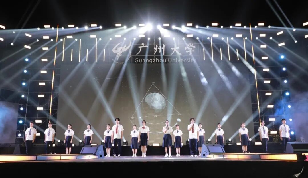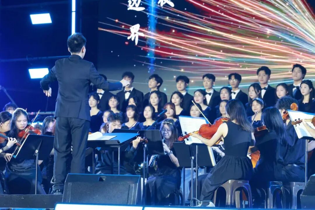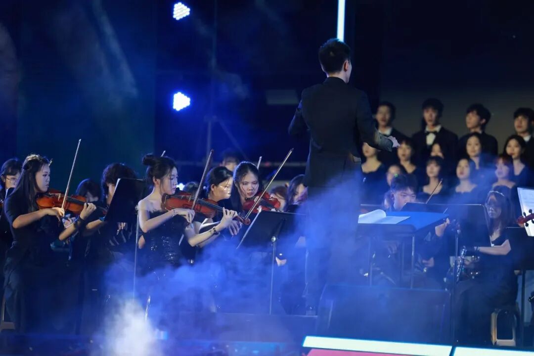 大提琴,小提琴,木管乐器,打击乐器相互配合,就像齿轮紧密咬合,共同推动机器高效运转。伴随振奋人心的乐声,LED大屏上展现广州大学骄人的成就:广大黄埔新校区正式启用;我校参与建设的首个全自动化码头矗立于粤港澳大湾区;祝贺我校在2024软科世界大学学术排名中位列中国内地高校第78位……管弦乐,这个音乐世界的宏伟画卷,总是以它那无与伦比的丰富音色和深邃情感,让人心醉神迷。“我的梦说别停留、等待。”广大新征程,我们随管弦乐曲一起启航。