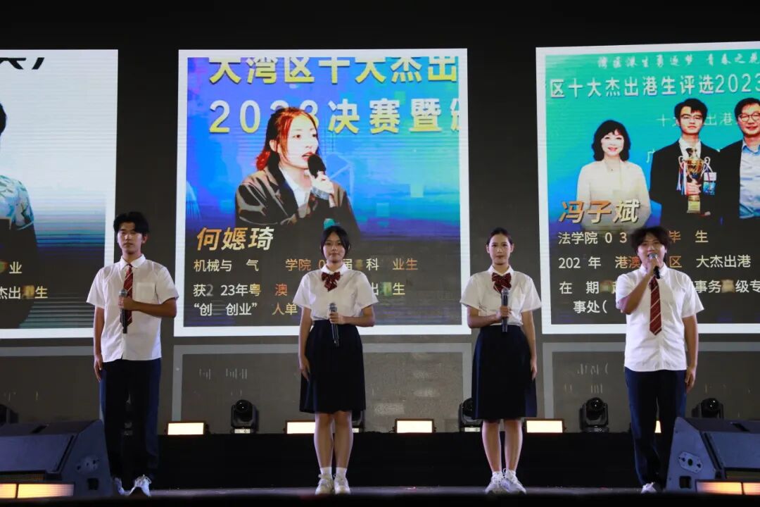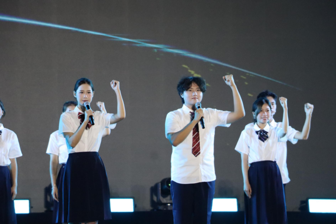 以激情朗诵展现青春学子勇敢逐梦,表演者们站在台上,声音时而低沉,时而高亢。优秀校友黄思静用热爱与汗水站上巴黎奥运会女篮的赛场,为国出战;优秀校友冯子斌在大湾区的星空下成长为十大杰出港生,赴联合国实习;优秀校友郭嘉峰成为粤语文化传承推广者,创立《粤知一二》;不同学科专业的青年们组建363只队伍,参与广东省百县千镇万村高质量发展工程,燃烧自我,成为自己的光。“自成一个宇宙,让自己成为焦点。”