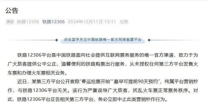 近日,某第三方平台公开宣称“春运抢票开始”“最早可提前90天预约”,12月11日,“铁路12306”微信公众号发布公告:此消息纯属平台营销炒作,与铁路12306平台无关。该行为严重误导广大旅客,扰乱火车票正常票务秩序。对此,铁路12306平台正告相关第三方平台,务必立即中止此类营销炒作行为。