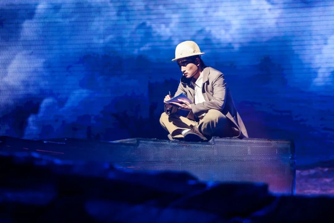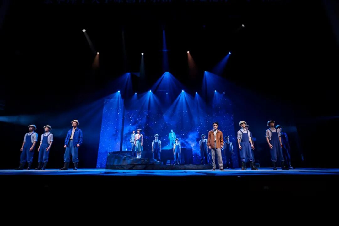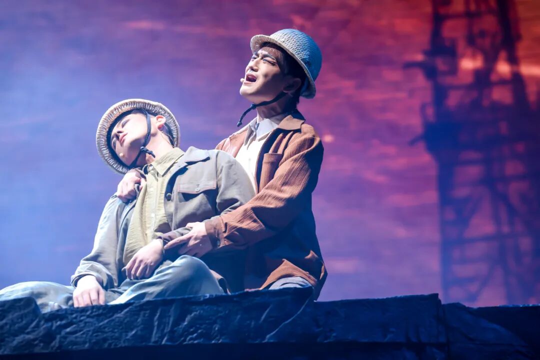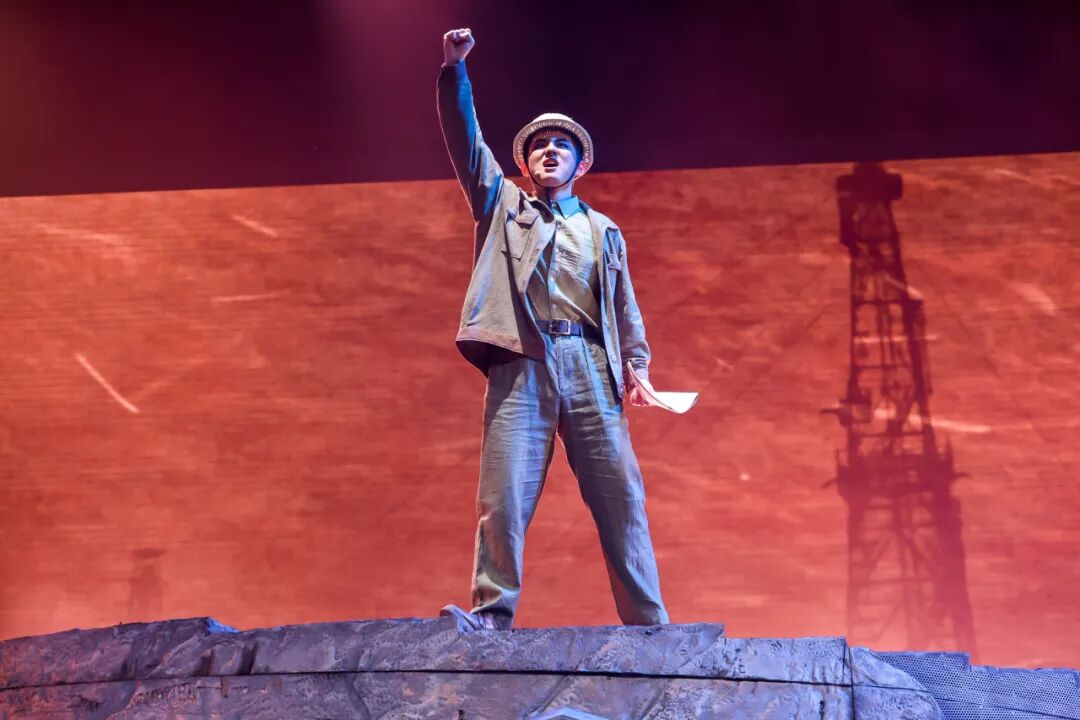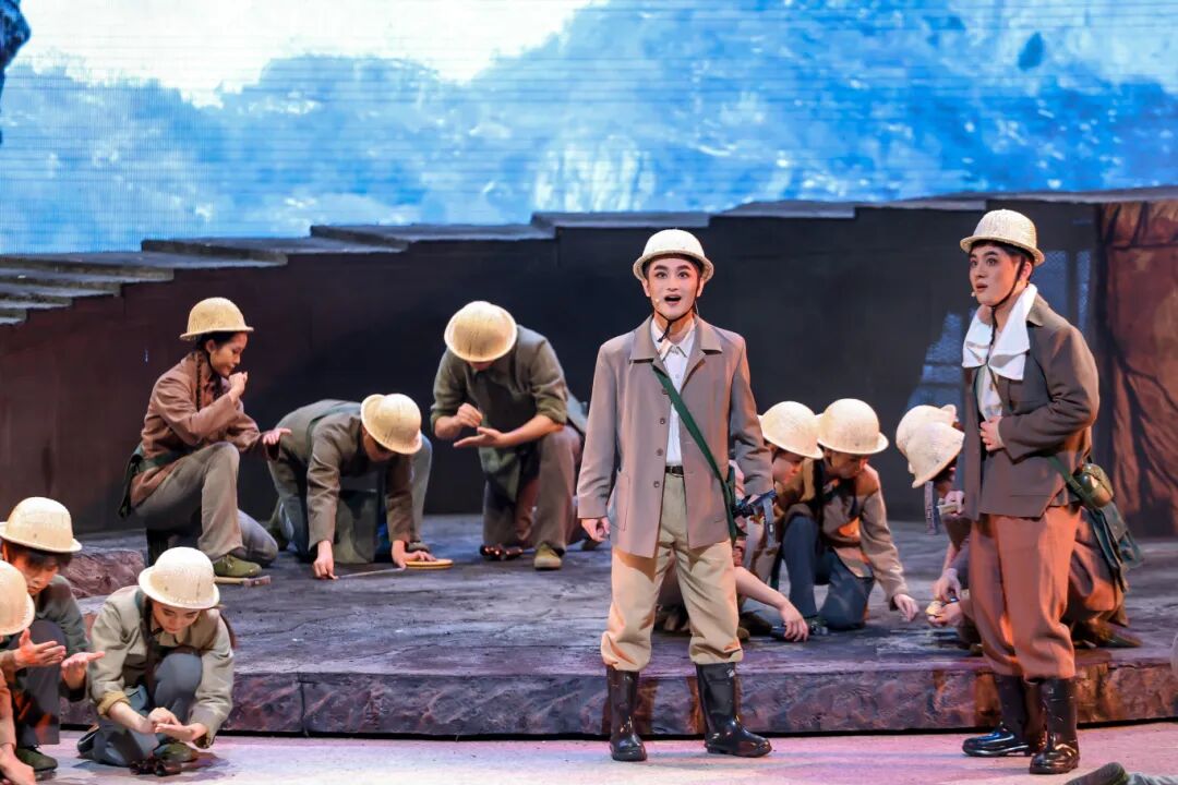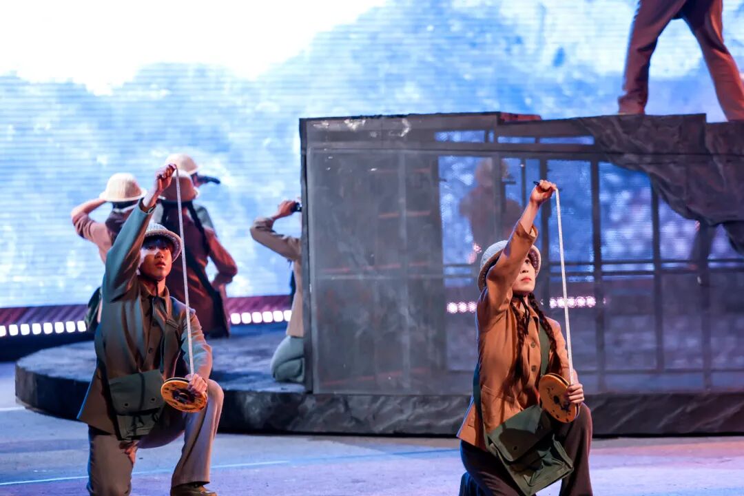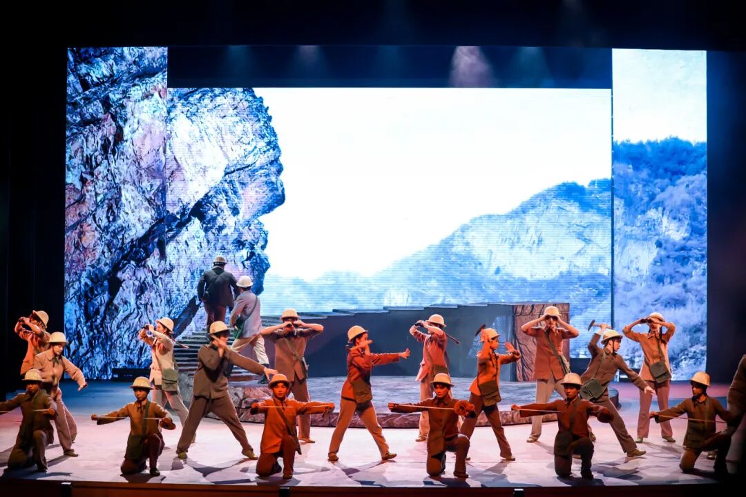 勘探队员们身处荒漠深沟,面对恶劣环境,他们从未放弃,始终坚守在勘探一线。鲁平因积劳成疾而倒下,张华与队长等人对是否继续勘探的激烈争论,进一步凸显了核工业人在面对困境时的抉择与担当。舞台上,狂风呼啸、飞沙蔽日,勘探队员们的身影在风沙中若隐若现,他们的歌声高亢而有力,仿佛在与大自然进行着一场无声的较量。