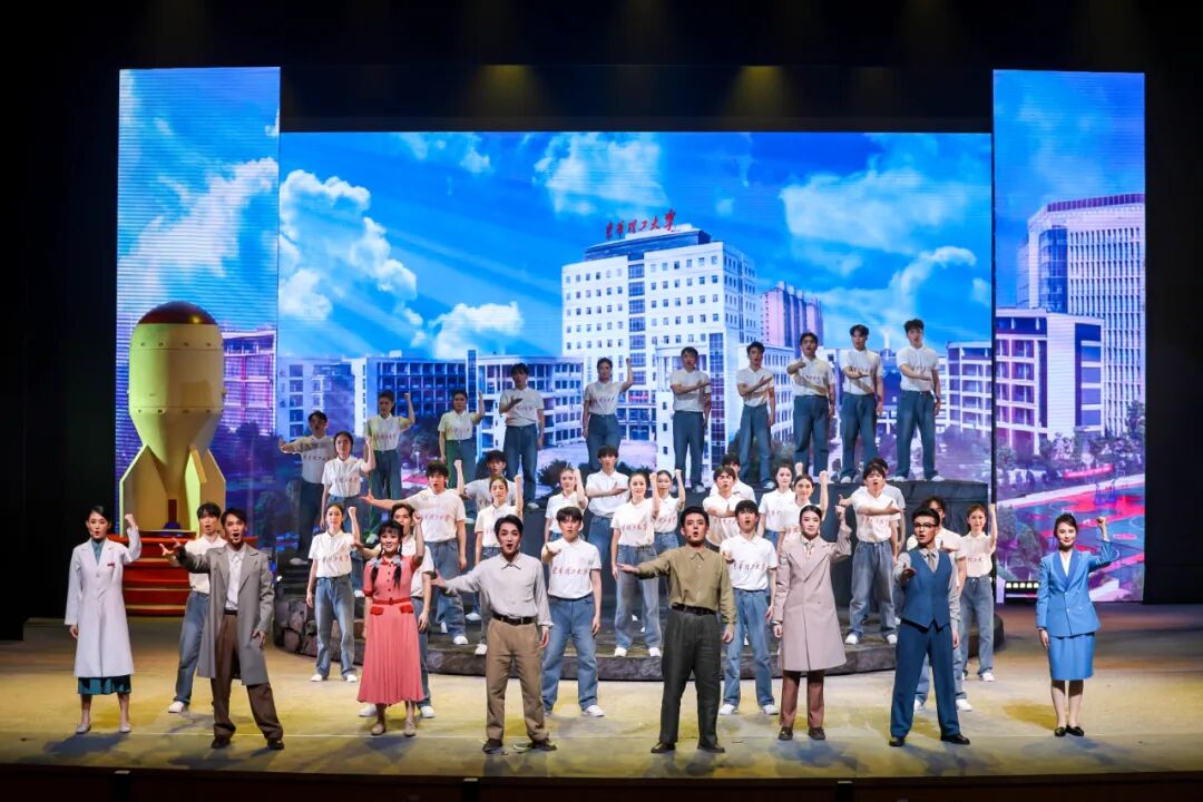 舞台上,东华理工大学师生们用精湛的演技,将剧中人物的家国情、夫妻情、父子情、师生情、兄弟情展现得淋漓尽致。该剧巧妙地运用了现实主义和表现主义相结合的美学理念,将人物的情感交流、生活状态、工作场面用歌舞化、意象化的形式予以表达,让全剧既有家国情怀的澎湃激情,又有细腻入微的情感流淌,为大家带来了一场视觉与心灵的双重盛宴。