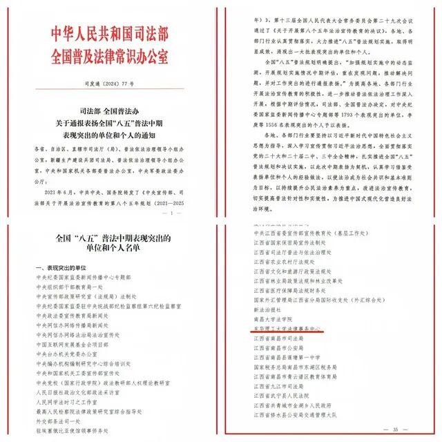 近日,司法部、全国普法办发布《关于通报表扬全国“八五”普法中期表现突出的单位和个人的通知》,对1793个表现突出的单位,1556名表现突出的个人予以通报表扬。东华理工大学法律事务中心获评全国“八五”普法中期表现突出单位。
