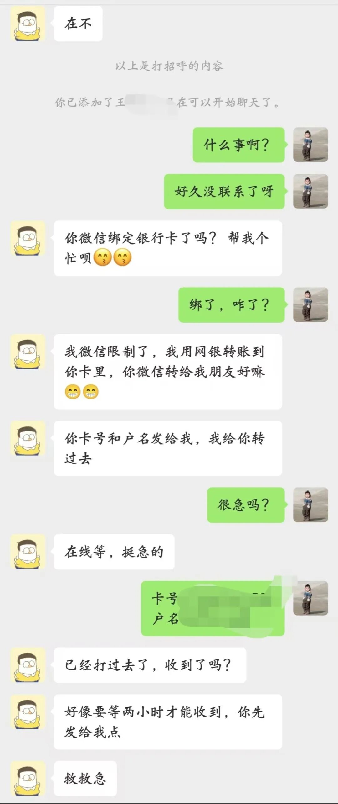 小王是一名大二学生,许久没有联系的“亲友”突然加他好友。而加上好友的第一件事竟是找他以网银换微信,看着“亲友”着急的模样,善良的小王立马打算帮忙。