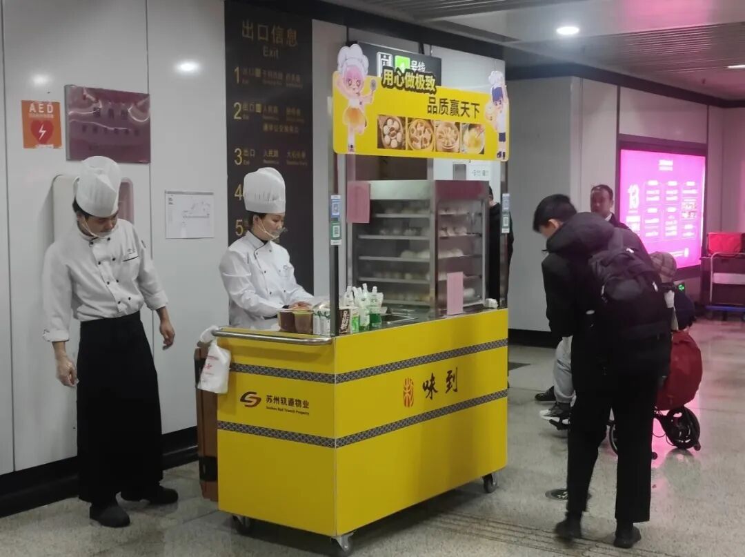 目前,乐桥站“味到”早餐小车位于4号线同里方向站台与1号线换乘通道。东方之门站“味到”早餐小车位于1/3号线换乘通道。餐车开放时间为工作日早上7:30-9:30。