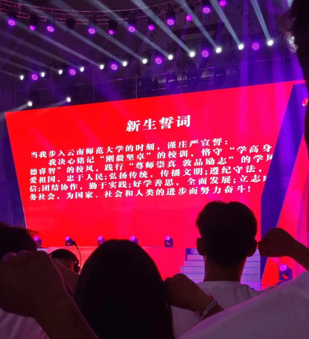 还记得参加开学典礼的那一天,我深切感受到了云师对每一位学子的用心与诚意。当我们一同在开学典礼宣誓时,握紧右拳,庄严郑重的氛围深深感染了我。我也被激励着,希望在未来能够像誓词一样“好学善思,全面发展”。我会用实际行动去实现我对自己的承诺,展现云师学子的责任与担当。