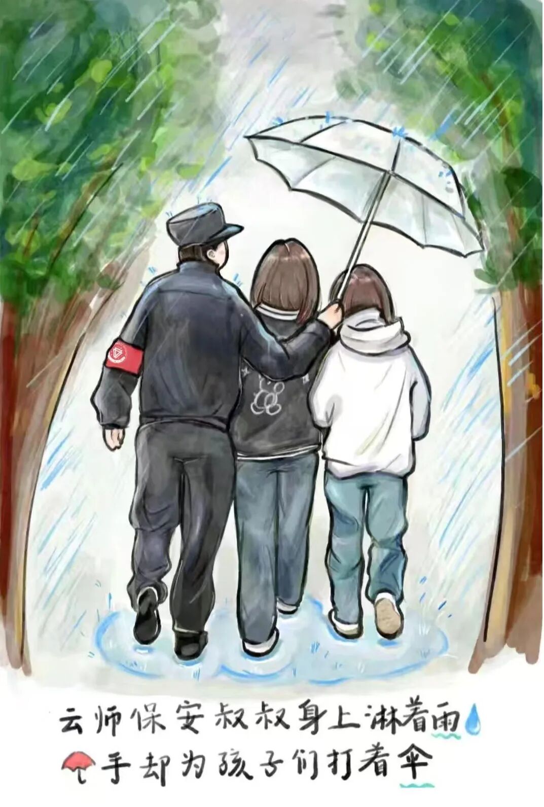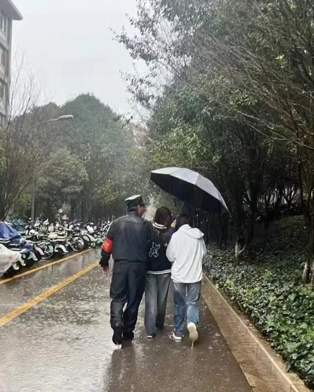 2024年10月16日下午,我正准备回宿舍,突然下起了大雨,我在教学楼下等了一会,在回宿舍的路上看到保安叔叔给两个女同学打伞,我就想着记录一下,拍下了保安叔叔为她们打伞的场景。这个画面让我特别特别感动,爱是一把倾斜的雨伞,师大的爱在每个细节里,每一个细节点滴汇聚成了温暖的云师记忆。
