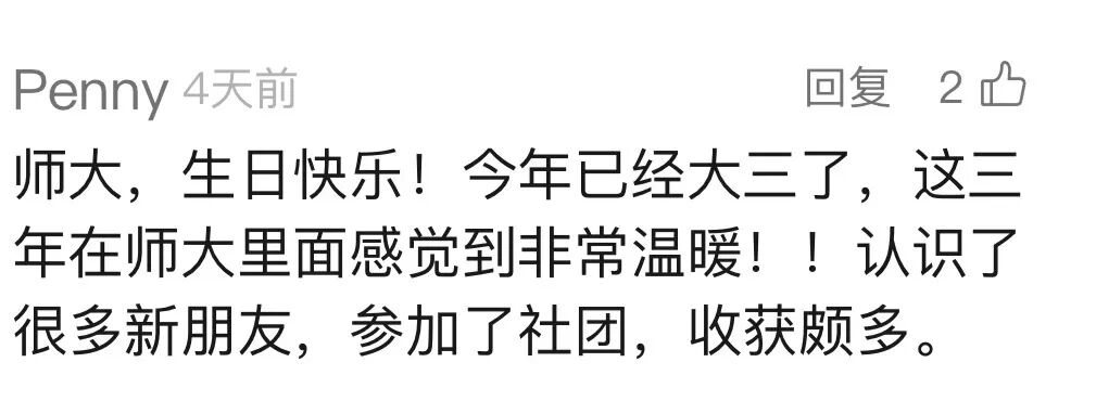 “今年中秋,我们宿舍一起领了学校送给学生的月饼。这盒月饼,对于我们来说不仅是传统的礼物,更承载着学校对我们满满的关爱。这份来自学校的温暖让初次离家的我们,在中秋佳节找到了家的感觉。今天是师大的生日,在这特别的日子里,愿我们学校越来越好,祝云师生日快乐!
