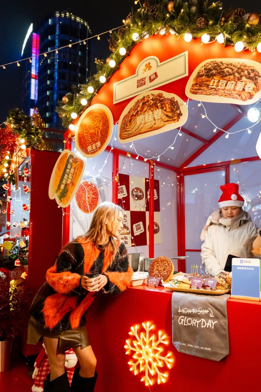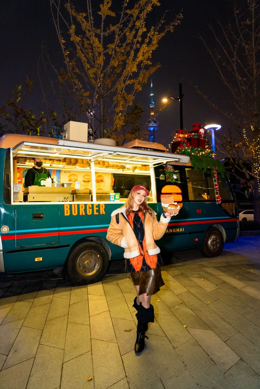 15座由星光点缀的红色小屋,一反传统木屋设计,背后的陆家嘴三件套更是点睛之笔,照片自带地标背景!胡桃夹子在市集入口打招呼,圣诞老人偷偷爬上屋顶,麋鹿雪橇车也悄然而至,好拍,好吃,好玩,圣诞氛围感拉满!这里可以一站吃遍沪上网红美食!魔都网红烘焙店Glory Butter带来与美国艺术家Daniel Arsha联名款国王饼,人气汉堡店磁食开来网红餐车,红颜融合菜餐厅的RED ROCK摊位则是肉食控的最爱!