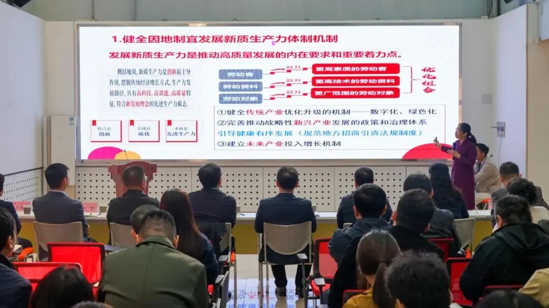 赵志勇老师围绕“健全推动经济高质量发展体制机制”这一重要内容,按照“什么是高质量发展——为什么要实现高质量发展——如何推动高质量发展”的逻辑思路,运用问题链教学、视频教学、典型案例教学等方式进行党的二十届三中全会精神融入示范教学。