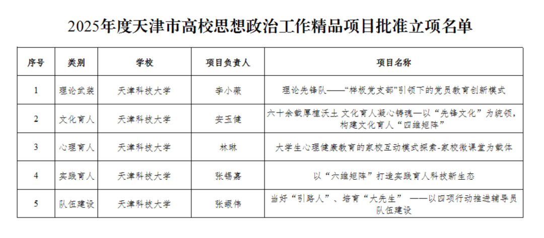 摘要:近日,天津市教育工委、市教委公布了2025年度天津市高校思想政治工作精品项目立项名单。六个项目类别中,我校在其中五个类别获批2025年度天津市高校思想政治工作精品项目。