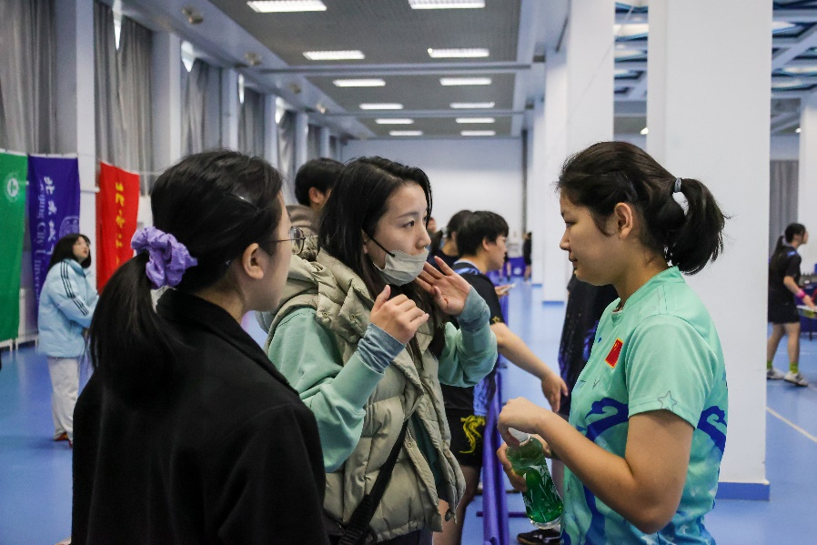 冠亚争夺战,男子团体对战老牌三连冠院校,双方一开场就展开了激烈的对攻,战况异常激烈。我院黄子宽、李孟鑫顶住比赛压力,凭借凌厉的正手进攻和灵活多变的发球让对手信服,赢得全场喝彩,展现出强大冷静的心理素质和高超的乒乓球技术,为我院争得荣光。
