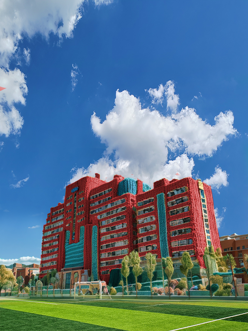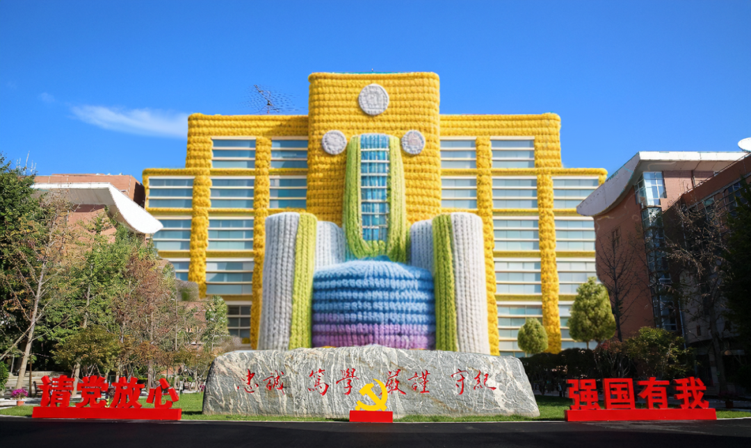 同学们好啊,我是你们的老朋友教学楼,看看我身上五彩斑斓的厚毛衣,还不想赶紧走进我的教室吗?快来和我一起遨游在知识的海洋里吧!