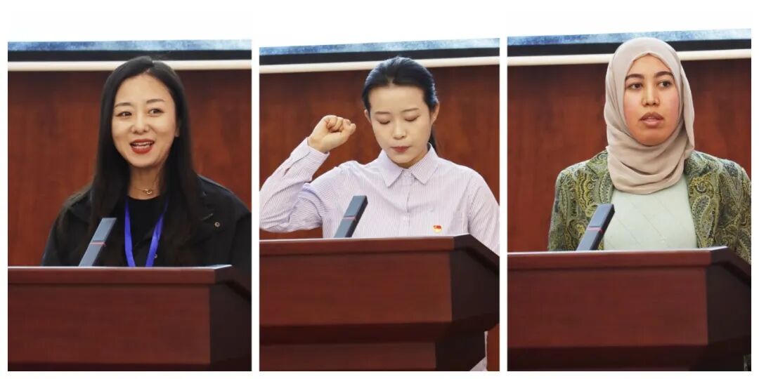 裁判员代表胡文婷,大赛参赛选手代表——中国学生鲁洋、突尼斯学生阿诗玛上台宣誓,表示将严格遵守赛项的各项规章制度,严格执裁、文明竞赛,赛出水平、赛出风采,彰显良好的精神风貌和竞技实力。