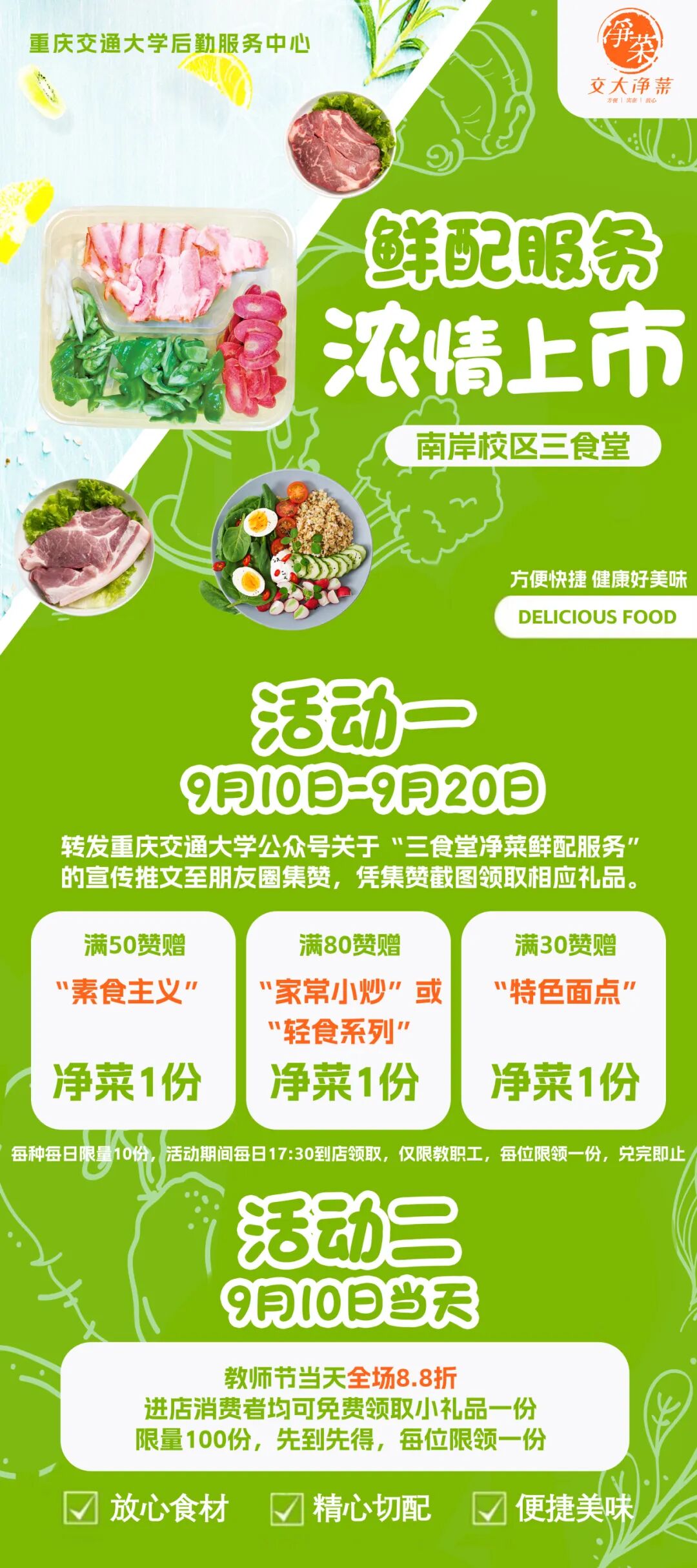 为庆祝第40个教师节,交大后勤为辛勤的老师们准备了一份惊喜!您准备好接收了吗?为解决教职工后顾之忧,告别繁琐的食材处理烦恼,交大后勤倾情推出净菜服务。
