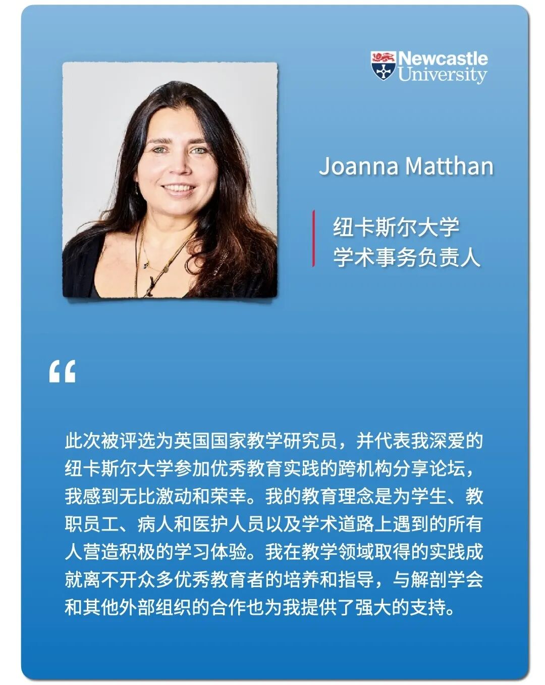 🏆纽卡斯尔大学学术事务负责人Joanna Matthan博士因在解剖学学科领域的卓越教学成就和创新教学方法荣获了「英国国家教学研究员」称号。