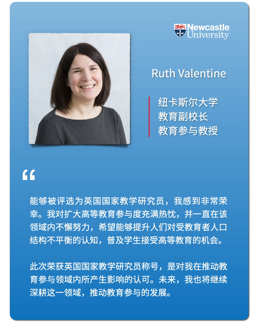 🏆纽卡斯尔大学教育副校长、教育参与教授Ruth Valentine因在改善学生参与机会领域所做的贡献而被授予「英国国家教学研究员」称号。