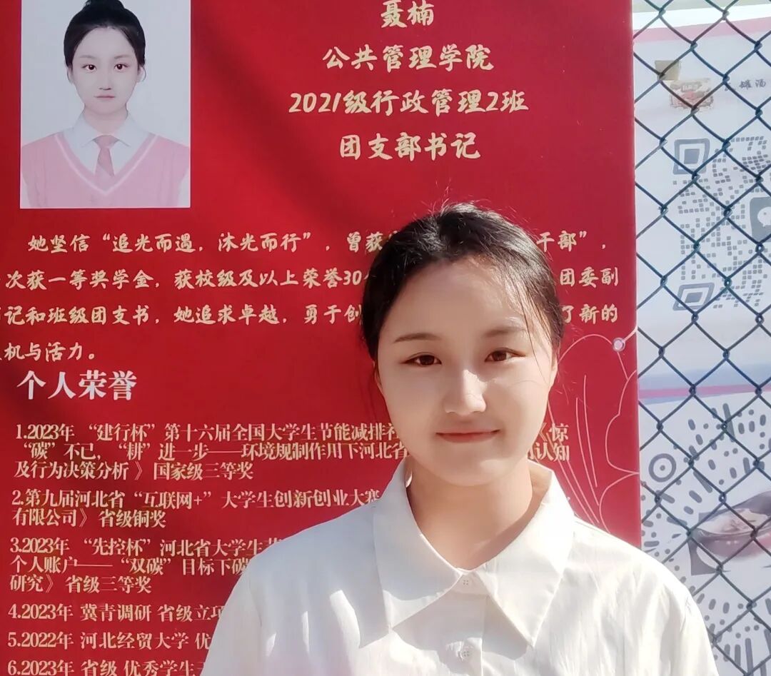 聂楠,中共预备党员,河北经贸大学公共管理学院2021级行政管理专业本科生,现任公共管理学院学生团委副书记、2021级行政管理2班团支部书记,第七届“河北经贸大学青年五四奖章"获得者,荣获“最美团支书”荣誉称号,多次获得一等奖学金,累计获奖30余项。
