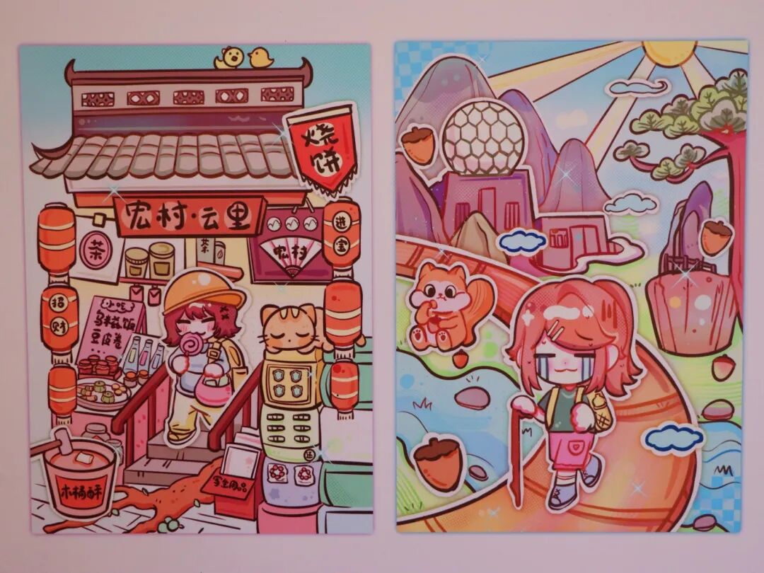 我将这幅画采用了分层构图的方式,分为上下两部分。上半部分主要展示店铺的外观,下半部分则展示店铺内部的场景。这种构图方式使得画面内容丰富且有条理,观者可以清晰地看到店铺内外的不同景象。我在画面中添加有许多可爱的卡通角色,这些角色形态各异,有的在货架上,有的在店铺内,仿佛在进行各种活动。角色的设计充满想象力,有动物形象、拟人化的玩具等,增添了画面的趣味性。画面中的传统店铺和各种玩具容易唤起观者的童年记忆,传递出一种怀旧的情感,通过丰富的色彩和可爱的角色设计营造出一种欢乐、轻松的氛围,给人带来愉悦的视觉体验。
