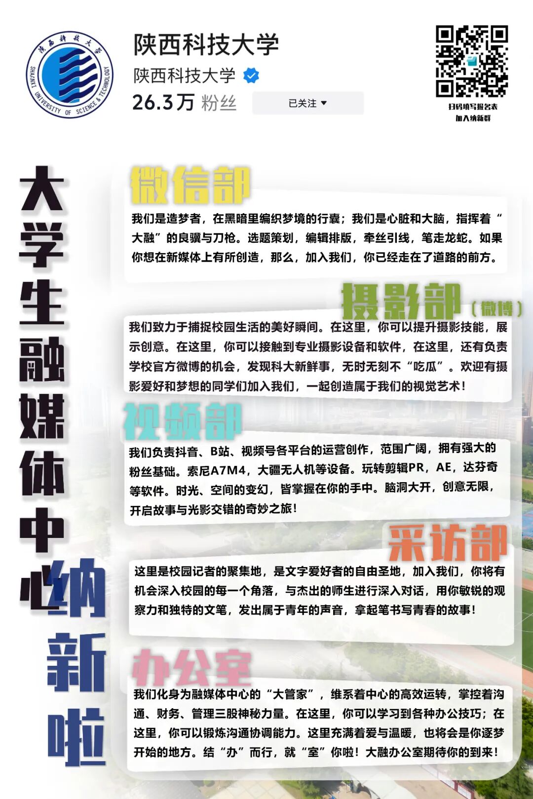大学生融媒体中心由微信部、摄影部(微博)、视频部、采访部、办公室五个部门组成。五个部门各司其职,运维陕科大各个官方媒体账号,为受众提供科大讯息与温暖力量!下面让我们来听听各部门的自我介绍吧!速速Pick你最想加入的部门!