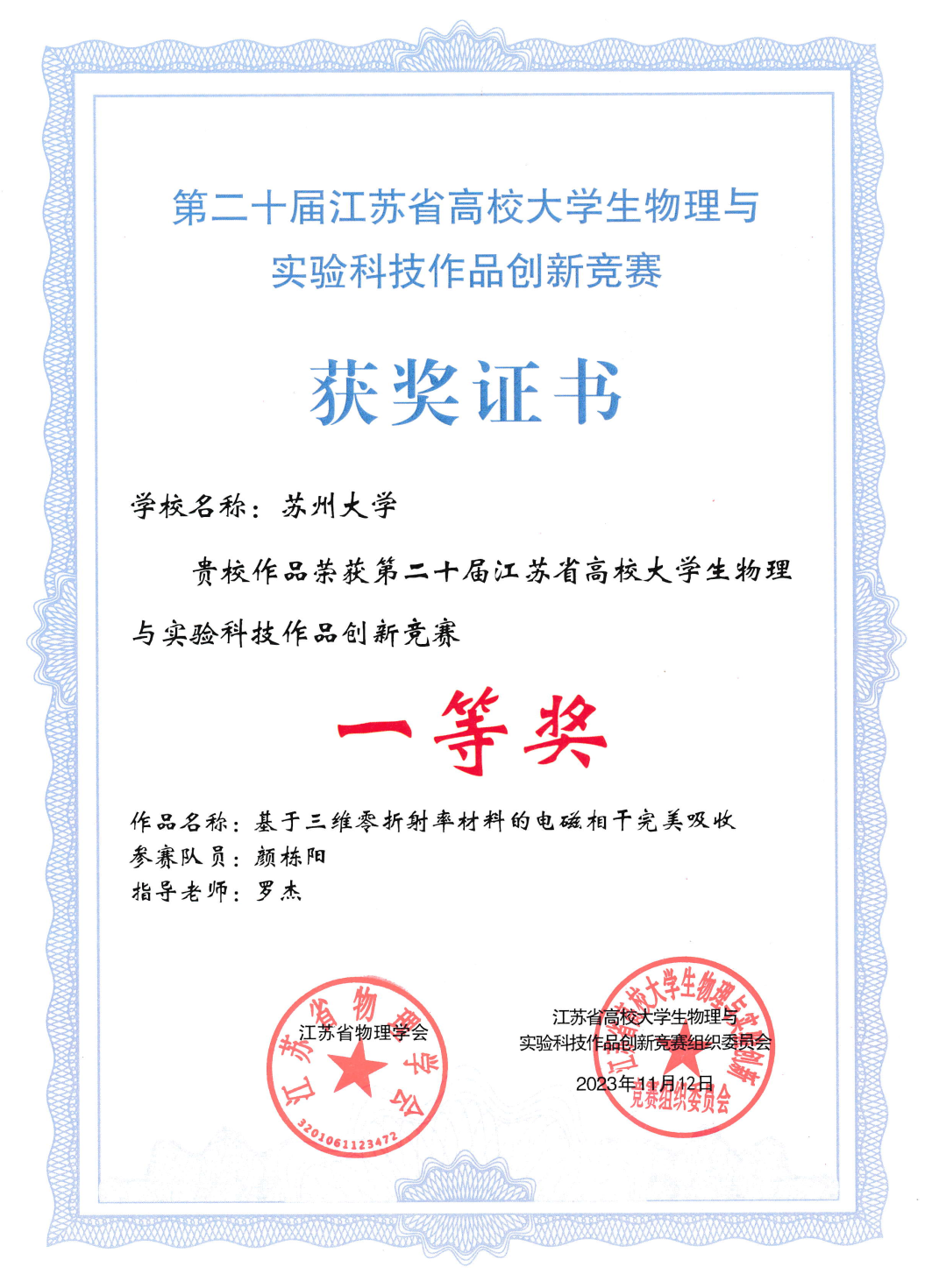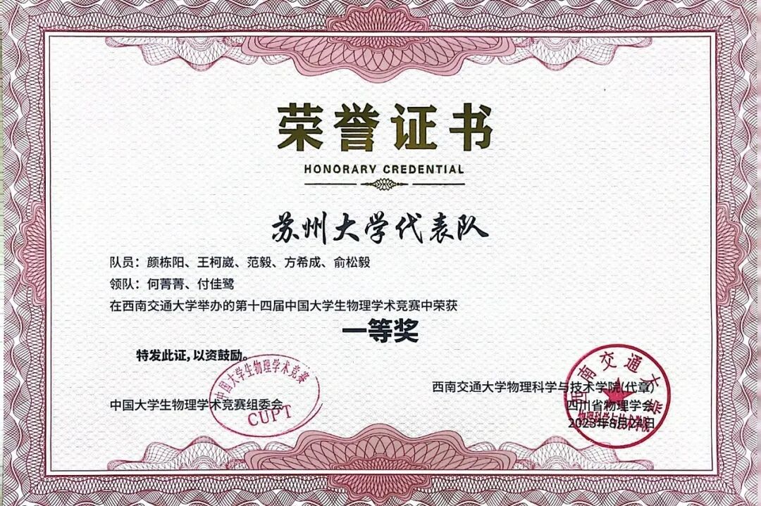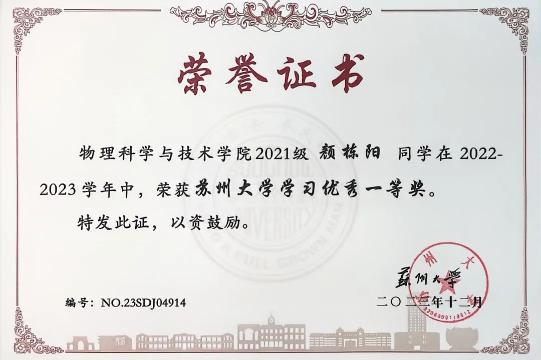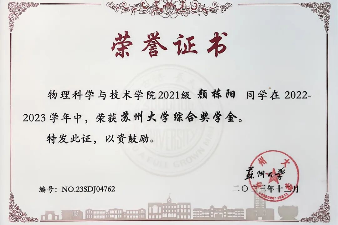 获奖情况:第十四届中国大学生物理学术竞赛一等奖、第二十届江苏省高校大学生物理与实验科技作品创新竞赛一等奖、苏州大学学习优秀一等奖、创新创业特等奖、综合奖学金等。