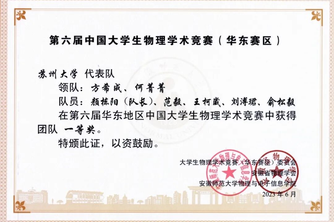 “如果说专业基础知识的学习可以充实自我,那么团队协作则是综合能力的体现。”在良师益友的助力下,颜栋阳积极参加各类学科竞赛,这不仅提高了他对知识的掌握程度和应用能力,也在不断的合作与学习中进一步完善了自己。他连续三年带领团队参加中国大学生物理学术竞赛,在国赛、华东赛、省赛均取得了一等奖的好成绩。“非常感谢团队中每位同学的帮助与包容,整个过程虽然比较艰苦,但是大家迎难而上,最终取得了不错的成绩。同时,这些宝贵和难忘的经历为我自主学习能力的提高打下了坚实基础。”