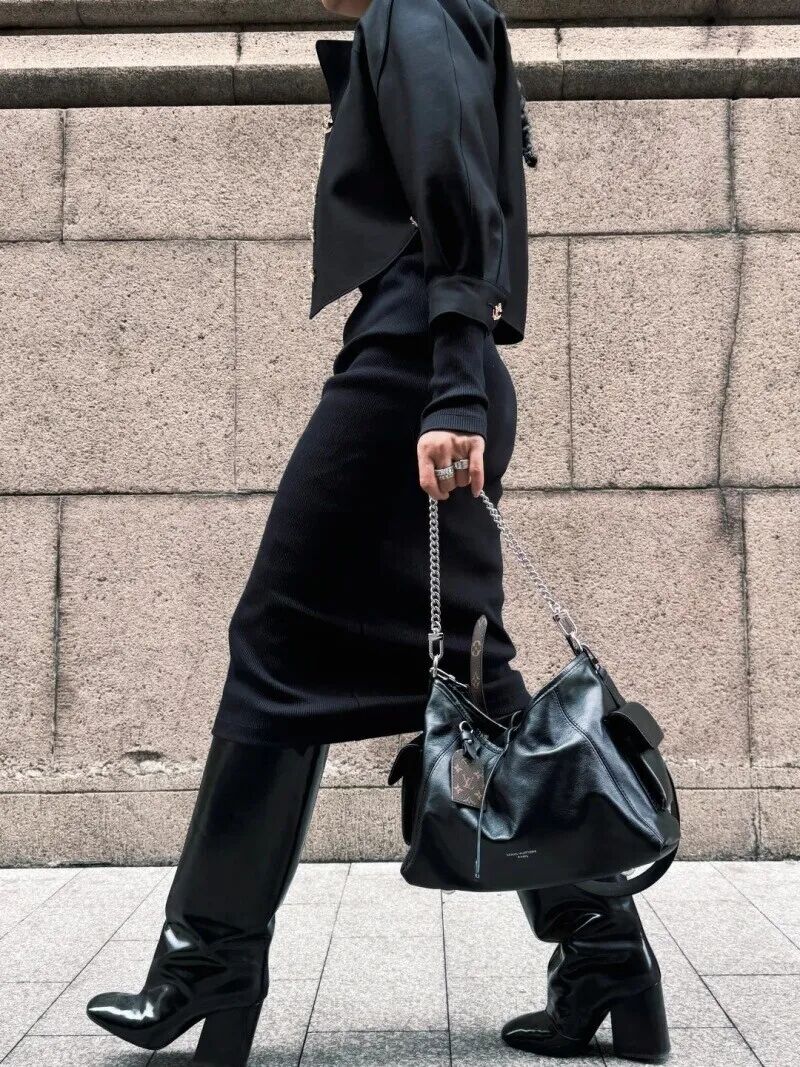 比起软塌塌的绒面材质,光滑的牛皮革、荔枝纹看着比较硬挺,更有种优雅、知性、大女人的味道。