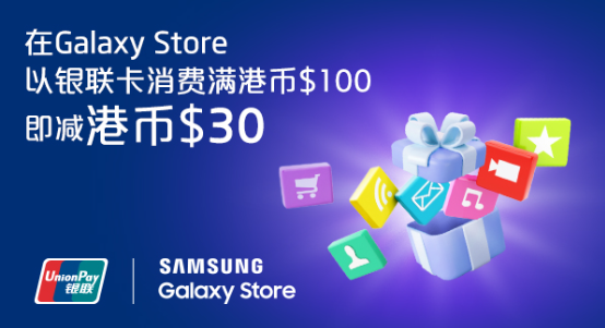 活动期内,参加者于Galaxy Store单次购物满HK$100或以上,并于结账时使用Samsung Checkout的银联付款方式付款之有效消费,可享HK$30折扣优惠。