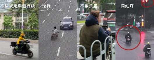 不戴头盔、闯红灯、逆行、不按车道行驶、醉酒驾驶等交通违法行为