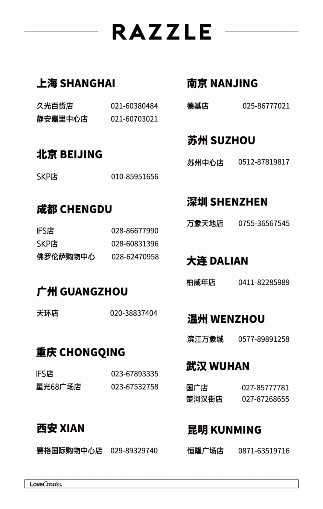 DAZZLE & RAZZLE 青绿系列 “青”承载着东方之初,从清微淡远到光芒万丈,寓意着美好的到来。 “青绿”是中国红的对应色,拥抱青绿是一种可触动的温润喜悦。DAZZLE与RAZZLE于新年隆重发布青绿系列, 以时装语言叙述东方审美,拥抱青绿回归自然。携手联名舞蹈诗剧《只此青绿》呈现青绿新年系列, 以青年舞者张翰、孟庆旸的艺术张力碰撞时装生命力。只此青绿,不止青绿,是美没有尽头。何谓青绿?什么是青绿 是石青,是石绿,是蓝色与绿色之间;墨分五色,青分七样,是长空乘风而去的朦胧,是群峰围绕的巍然;什么是青绿 是茶,是香,是画,是花;一击一拂,一印一合;一时一景,一曲一伸;是处处风雅,是平常生活;什么是青绿 是二月天晴,春日见长。山有岩石与土壤的纹理,锦缎有丝与线的肌理;山川会浸染画布,蓝染会沉淀自然;什么是青绿 是画者设色,是诗人执笔;是舞者独步,是生命本色。自然是生命的主体,我们也是;心灵是审美的主体,身体的感受也是, 不非此,不即彼。只此青绿,不只青绿 是美没有尽头 拥抱青绿,承续东方美学 传承东方审美意趣 从青绿山水,到“雨过天青云破处”的瓷器,再到服饰,“青绿”跨越千载,延伸万物。温润澄澈的“青绿”,是宋徽宗钟爱的汝瓷,是辛弃疾诗中“青山意气峥嵘”,是乾隆年盛极一时的东青釉瓷。拥抱“青绿”,不仅是对千年东方文化审美的传承,也是一种对自然向往的情感延续。 触动温润喜悦 中华千年史卷中。“青绿'始终是自然万物发苏的象征。它是中国红的对应 色。是消融寒意后的温暖与清新。新年之际与之拥抱,是可触动的温润喜悦,也寄予了新岁的美好期盼。回归自然 青绿山水,是中国独有的设色画,有别于水墨画的黑白色调,青绿是对自然本色的还原。 DAZZLE青绿新年系列以刺绣、提花织锦等东方工艺展现寓意吉祥富贵的葫芦与梅花,应用于满绣四季针织、团花魔方旗袍、新中式外套、斜襟鱼尾裙等成衣与配饰系列; 温润连结青绿、品红、墨黑等祥瑞色彩,以当代时装承载喜悦迎接新年的吉祥好运。 RAZZLE青绿新年系列以铜钱、年兽、中式建筑等元素与时装进行有趣结合,系列包括传递圆满、富贵的铜钱纹四季针织;趣味年兽绣花卫衣;东方意境的屋檐、山峦的植绒印绣T恤,提花衬衫与两件式中式棉服套装等单品,以肌理再造工艺呈现东方美学韵味。 青绿,从画卷而来,亦流向画卷。缓缓旋转的青绿空间,是山水画卷的延续。只此青绿,不止青绿 “青绿”不仅是一种服饰风格,更是一种生活态度,它兼容并包、融合古今。而借由“青绿”,地素时尚也希望传递出一种生活哲学。 拥抱青绿,美美与共 LOVECREATS