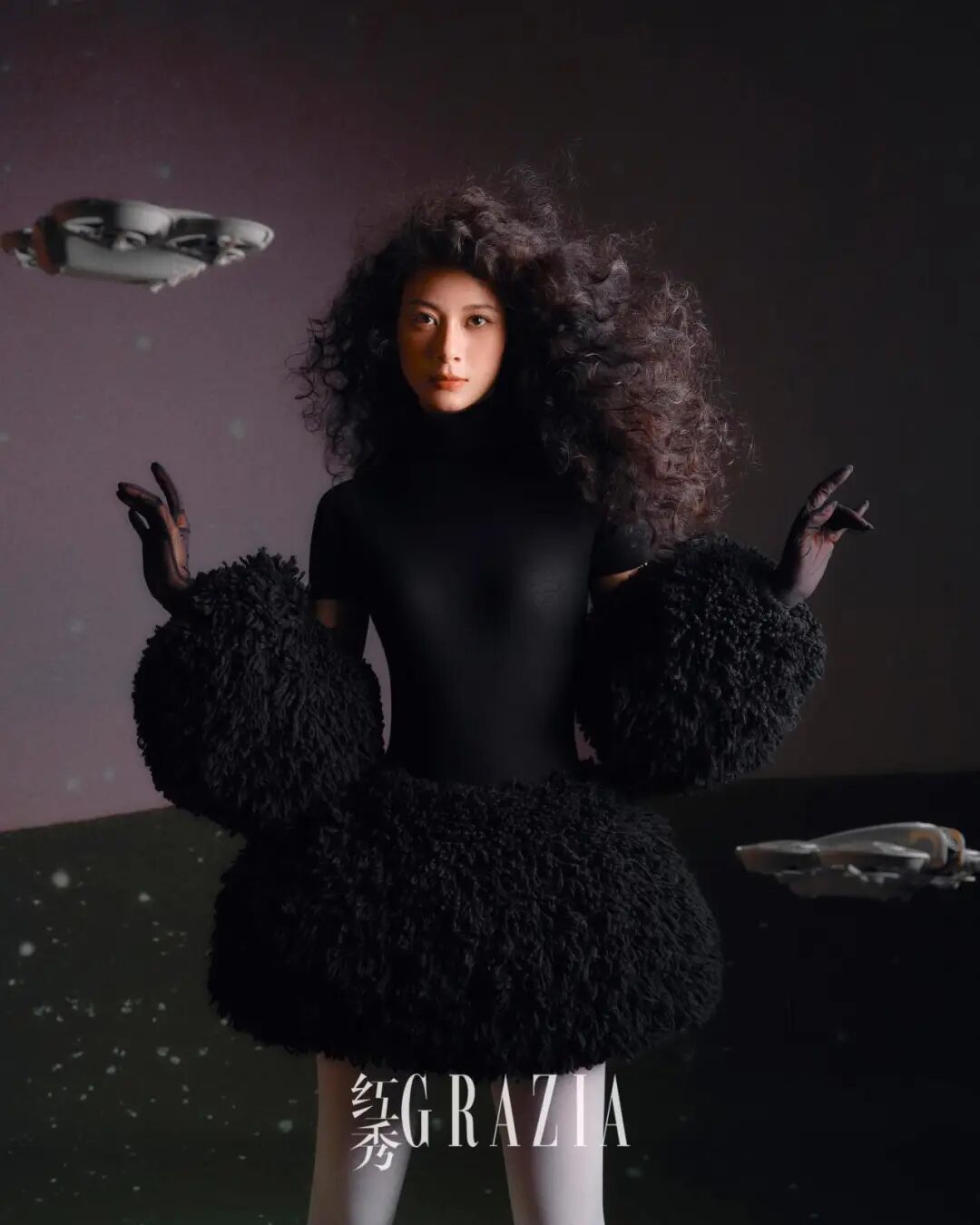 黑色针织连体衣、短裙、黑色高跟鞋、针织手套 / 均为ALAÏA