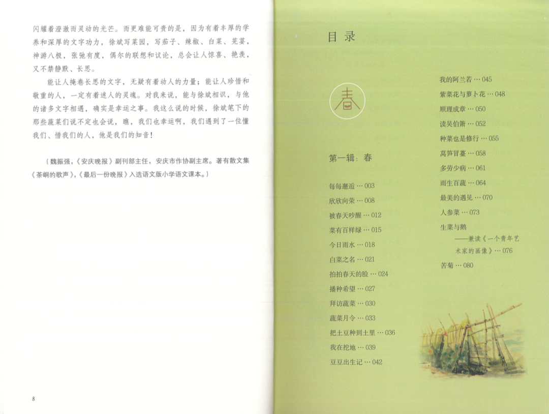 本书是一本充满诗意与哲思的种菜散文集,划分为春、夏、秋、冬四个篇章,精心描绘了种菜的过程与心得体会。菜有百样绿,把土豆种进土里,一茎山药爬上来,撒把菜籽便成景……笔到意随,就像作者的这一方菜园,带给人自然清新的阅读享受。