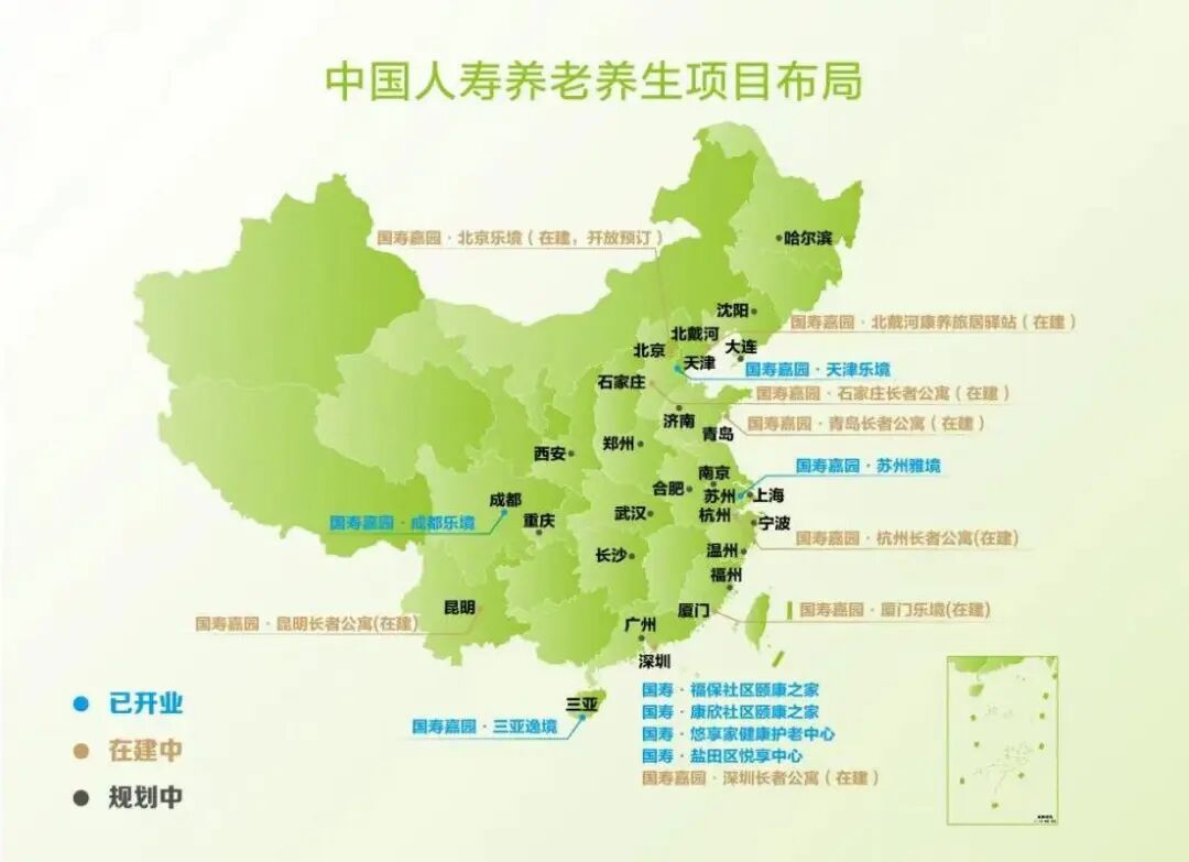 中国人寿围绕“吃、住、医、护、乐、学、游”的多元化需求,提供“医养结合、活力养老、专业照护、候鸟旅居”的一站式综合解决方案,并在多个养老养生项目中得到良好的实践,目前已在全国10多个城市投资建设多元化的优质养老养生项目15个,可提供各类床位近万张。